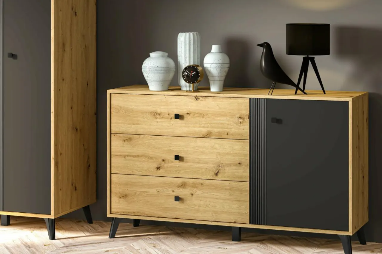 To propozycja do nowoczesnych wnętrz. Połączenie czarnych elementów z wybarwieniem w kolorze dąb artisan sprawia, że meble sprawdzą się we wnętrzach urządzonych w stylu loftowym.