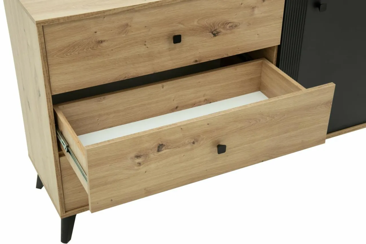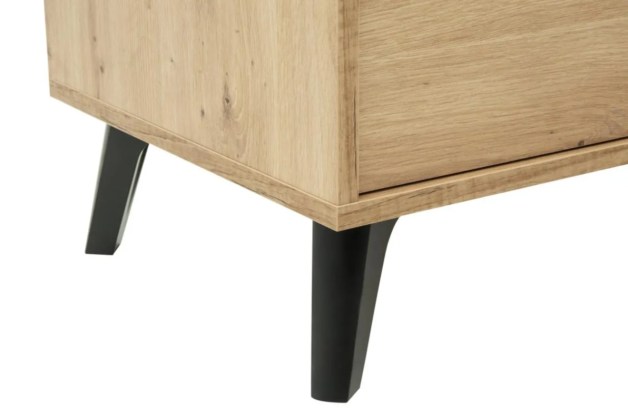 Wybarwienie w kolorze dąb artisan połączone z czarnymi elementami na froncie i ukośnymi nóżkami sprawia, że mebel odnajdzie się we wnętrzach urządzonych w stylu loftowym.