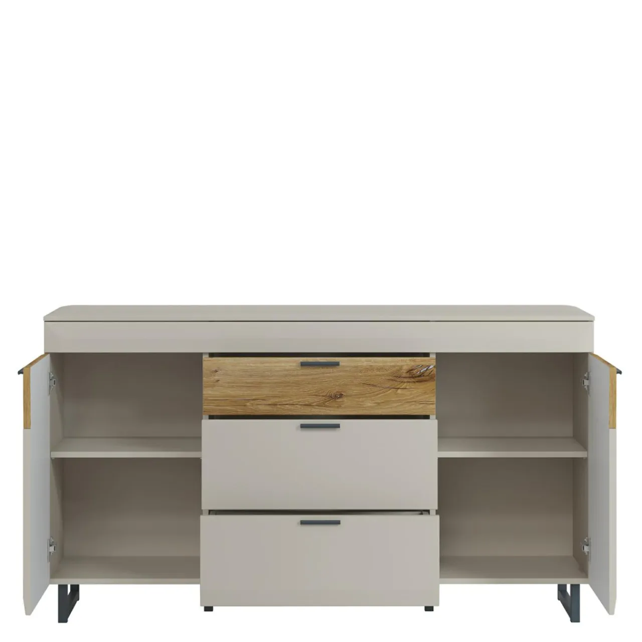 Wyposażona w 3 pojemne szuflady oraz 4 półki ukryte za podwójnymi drzwiami będzie doskonałym wyborem do Twojego wnętrza.