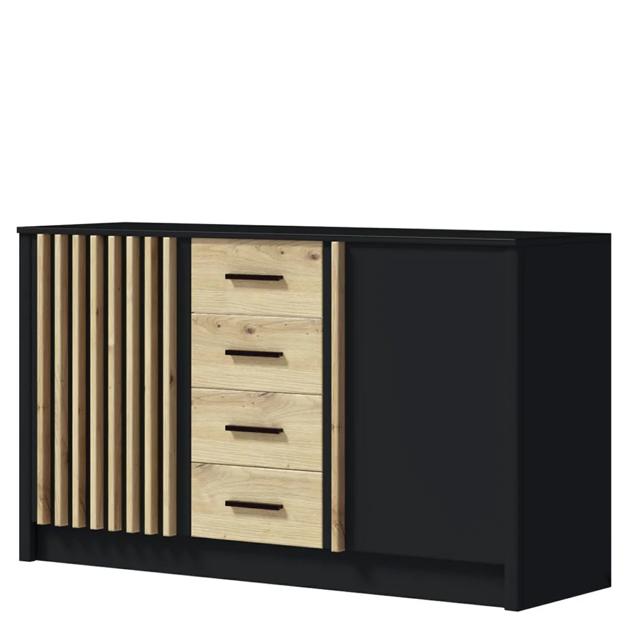 - Korpus komody wykonany jest z płyty meblowej pokrytej czarnym laminatem.