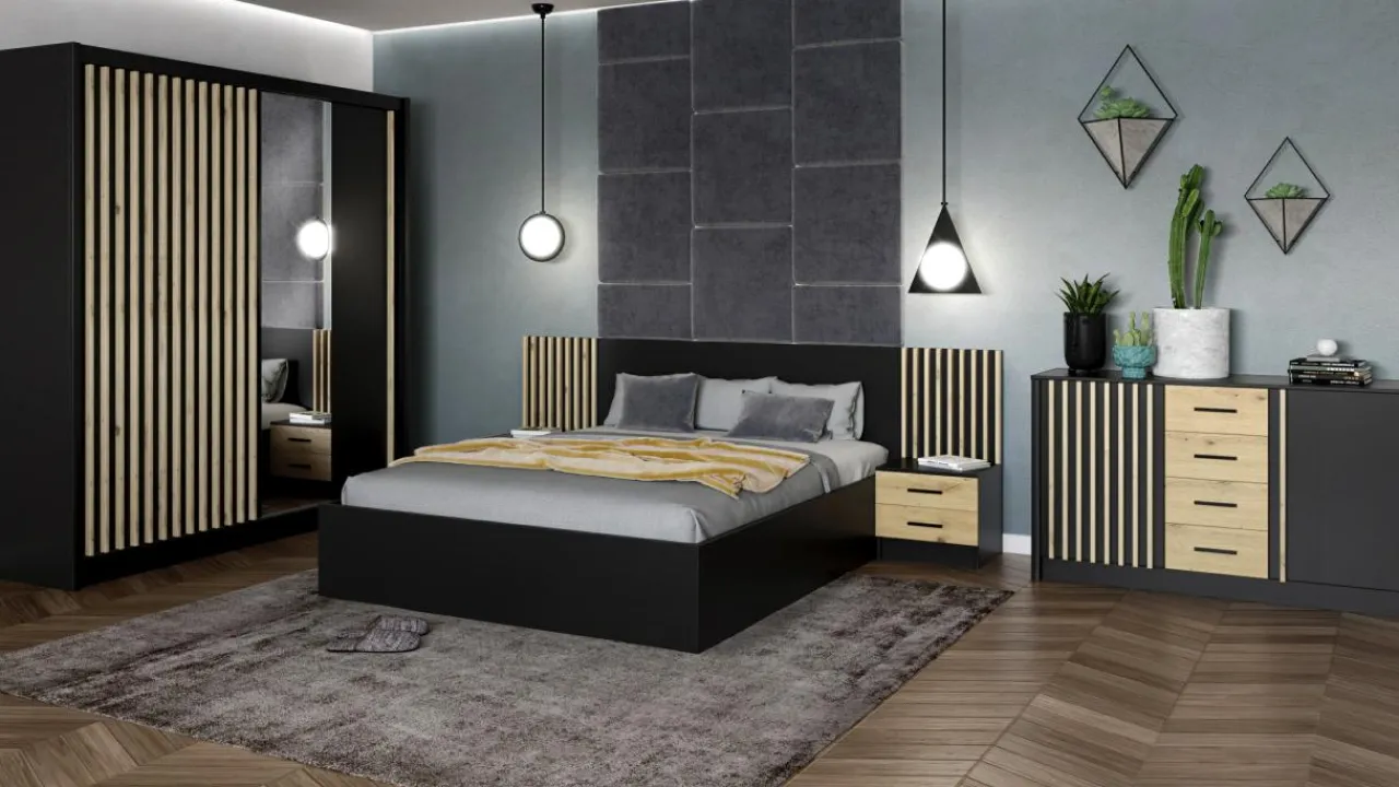 - Front stanowi czarna laminowana płyta ozdobiona lamelami w kolorze dębu artisan.