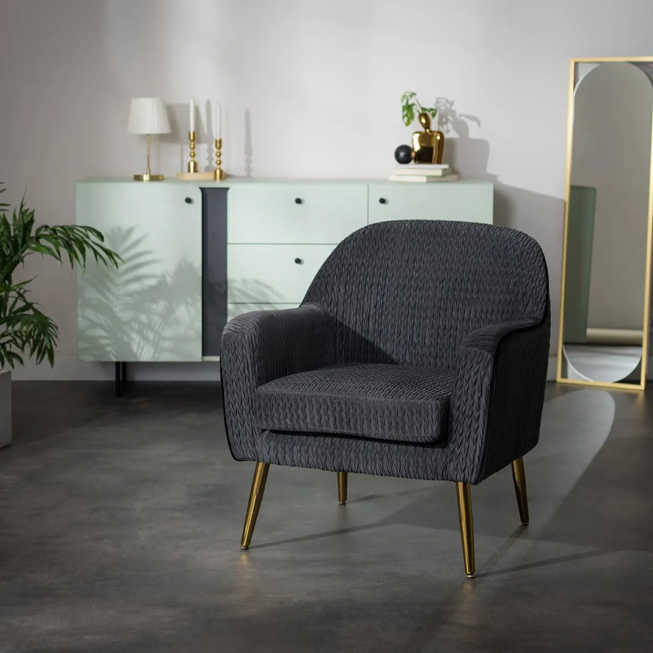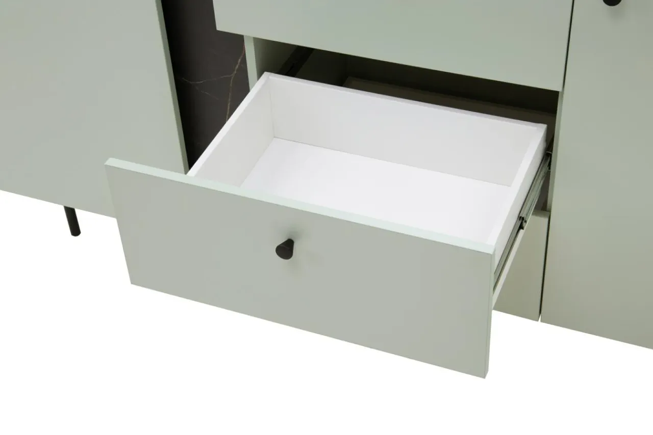 - Szałwiowe meble świetnie sprawdzą się łagodnej, industrialnej aranżacji. Surowa ściana, marmurkowe dekoracje to idealne tło. Dołóż pnące się rośliny, drewniane palety i czarno-białe dodatki, a uzyskasz efekt artystycznego salonu.