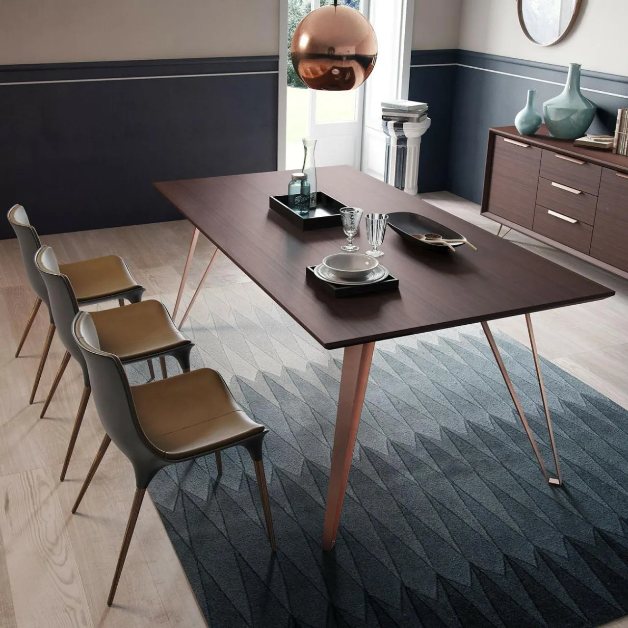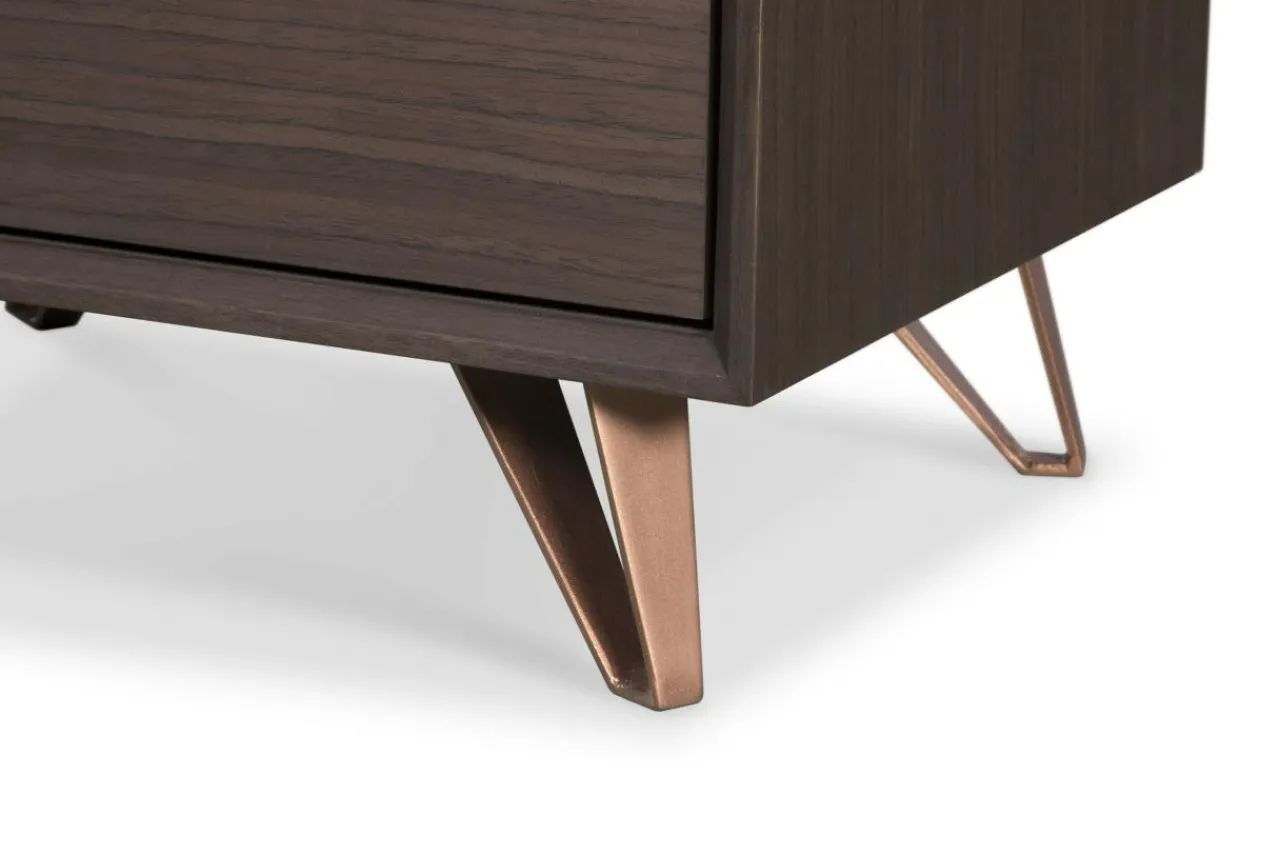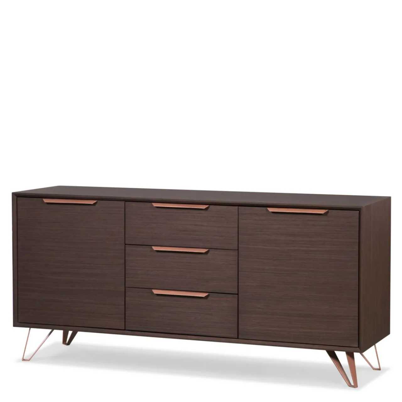 Usytuowany w jadalni, salonie lub pokoju dziennym zwraca uwagę funkcjonalnością oraz dyskretną elegancją, którą podkreślają nóżki oraz uchwyty w kolorze anodowanej miedzi.
