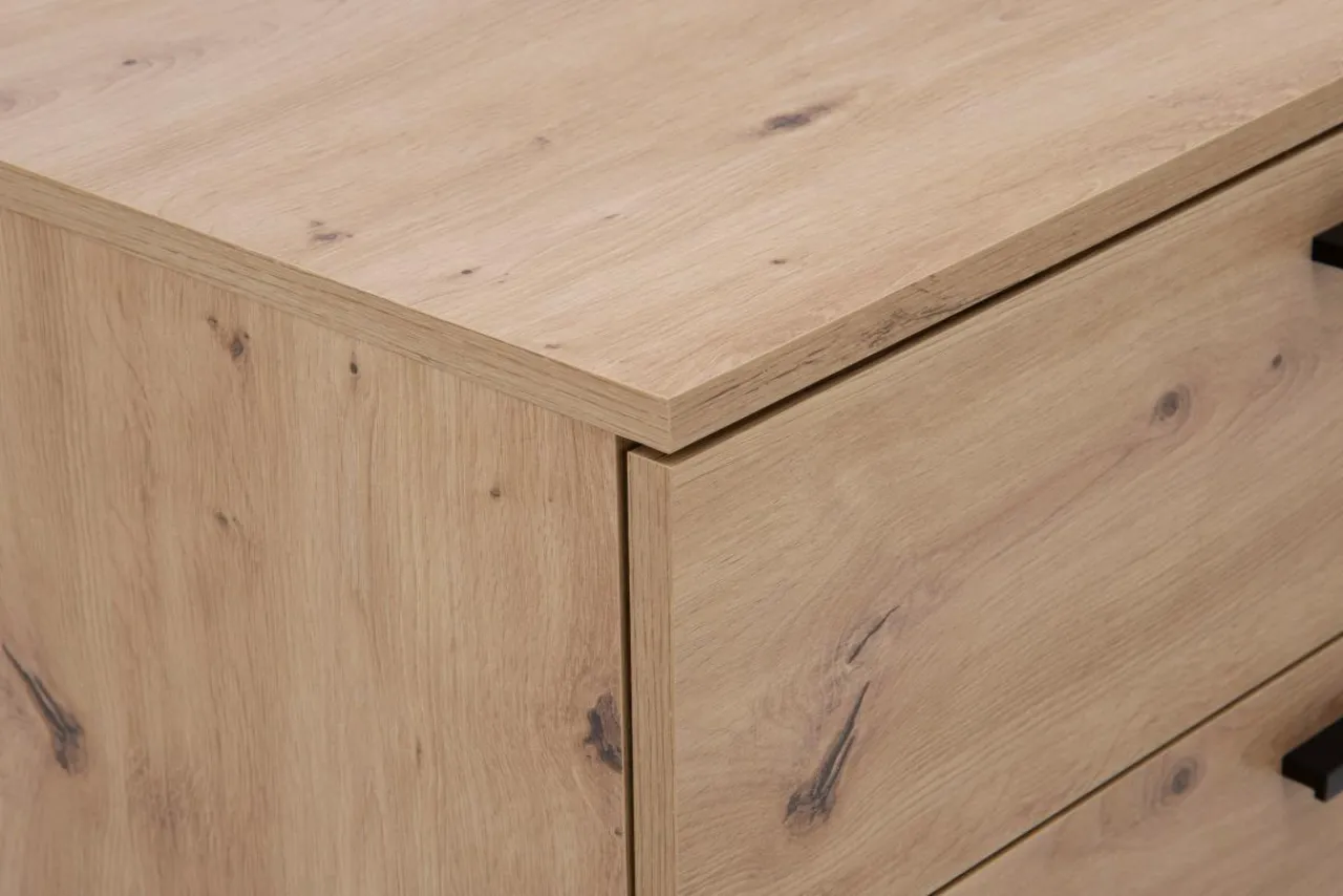 - Nowoczesny design, minimalistyczne uchwyty oraz wykończenie w kolorze drewna sprawi, że komoda MALTA uzupełni każde wnętrze w nowoczesnym stylu