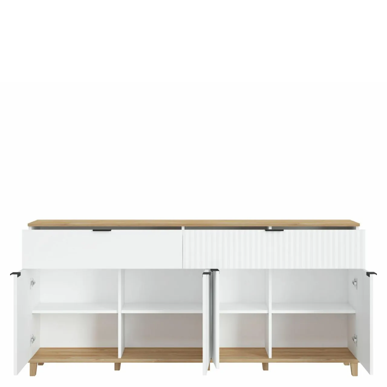 Minimalistyczny design, prosta bryła oraz drewniane nóżki sprawią, że przestrzeń Twojego salonu pozostanie jasna i przestronna, pomimo znaczącej pojemności komody PLISSEE.