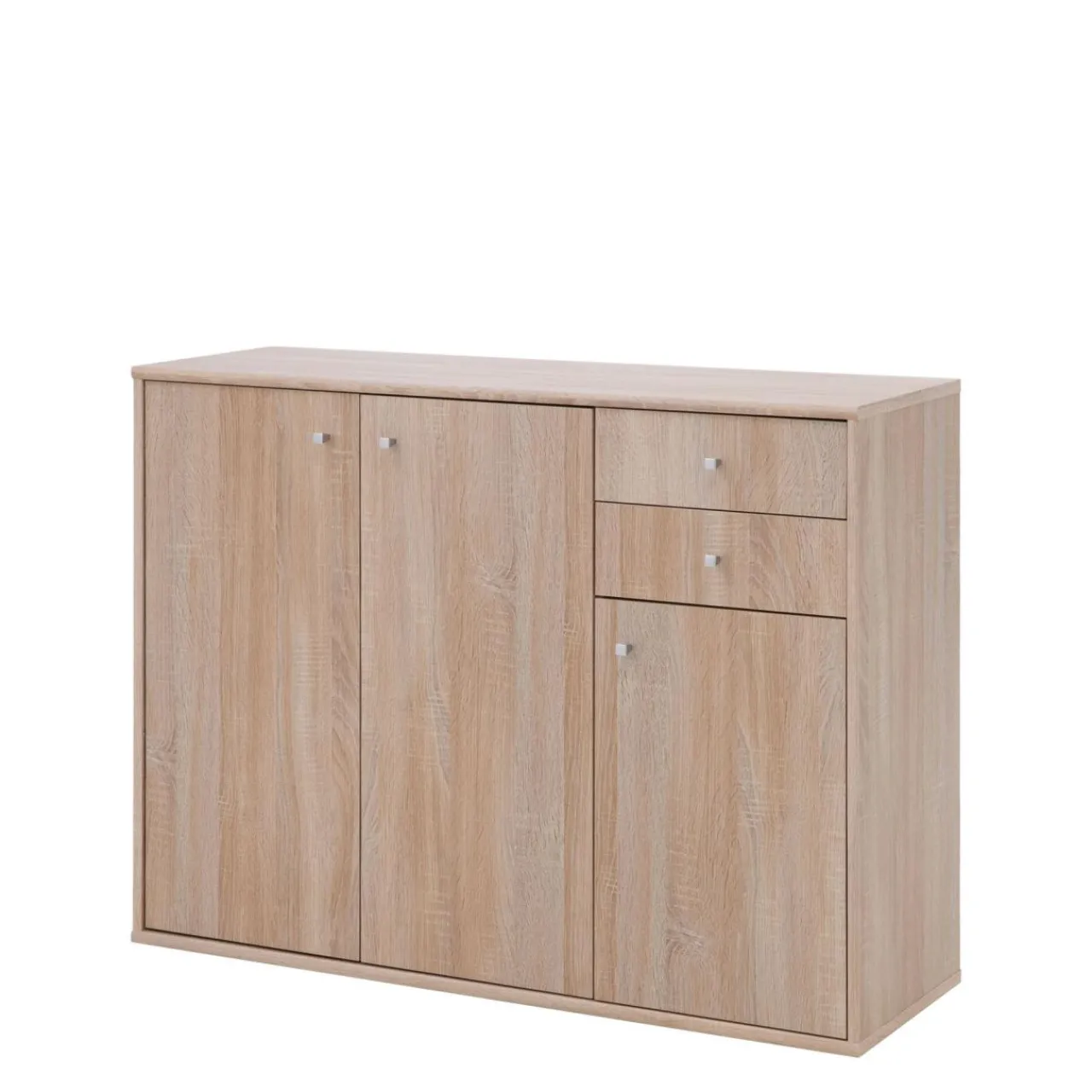 Doskonałym przykładem wykorzystania tej przestrzeni jest model komody wyposażony w 3 drzwi oraz 2 szuflady, w całości wykonany z płyty meblowej i wykończony folią.