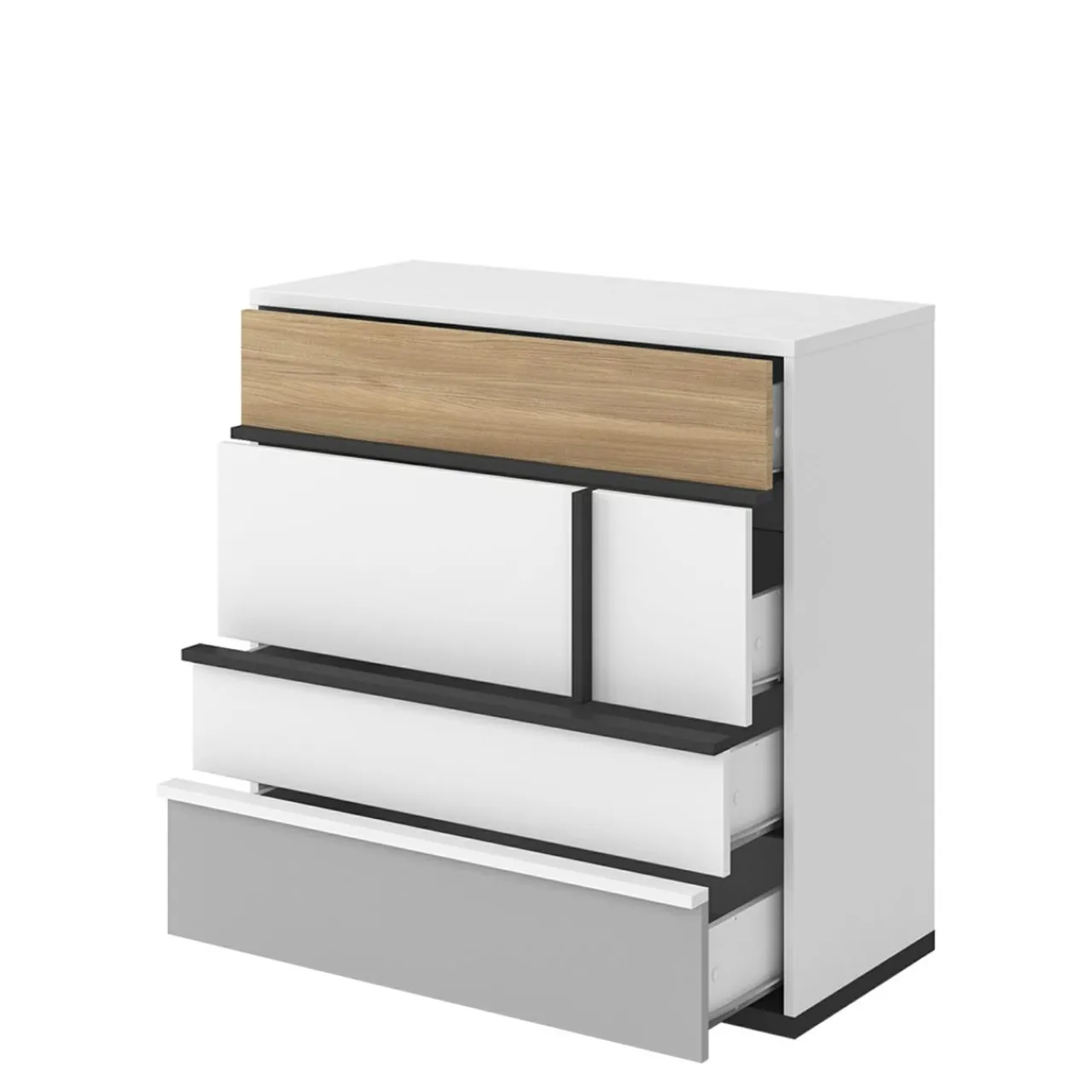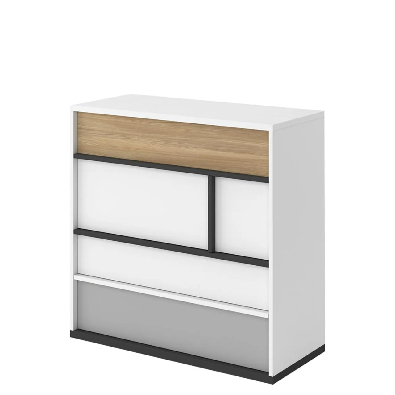 - Komoda ma 4 pojemne szuflady o różnych wysokościach.