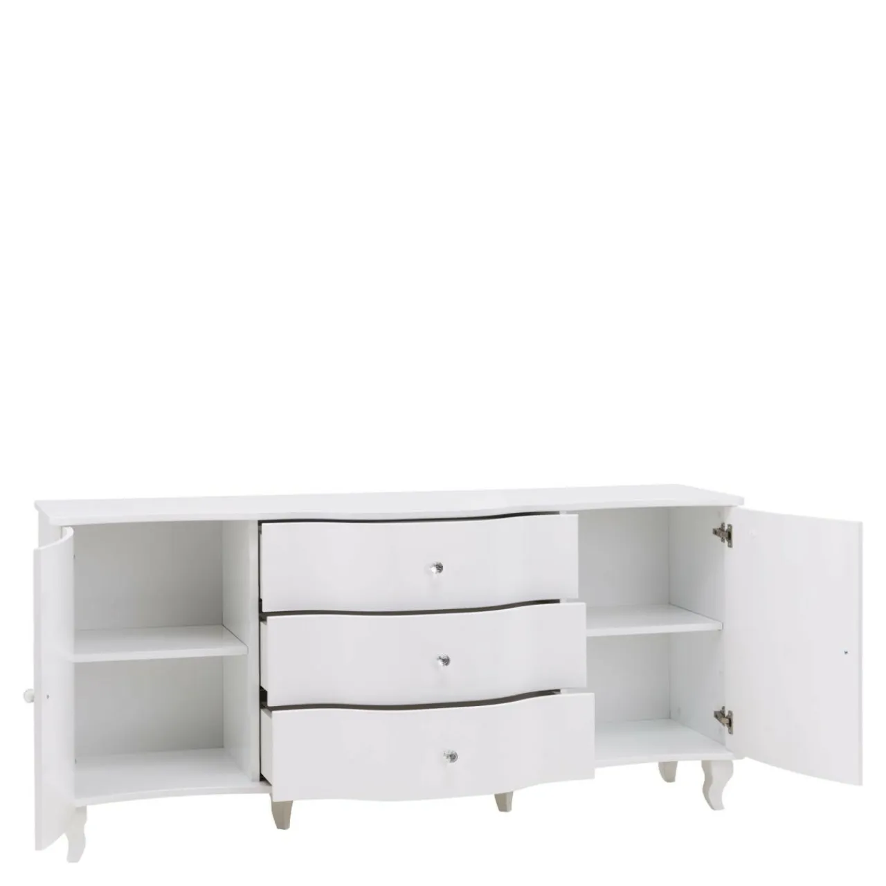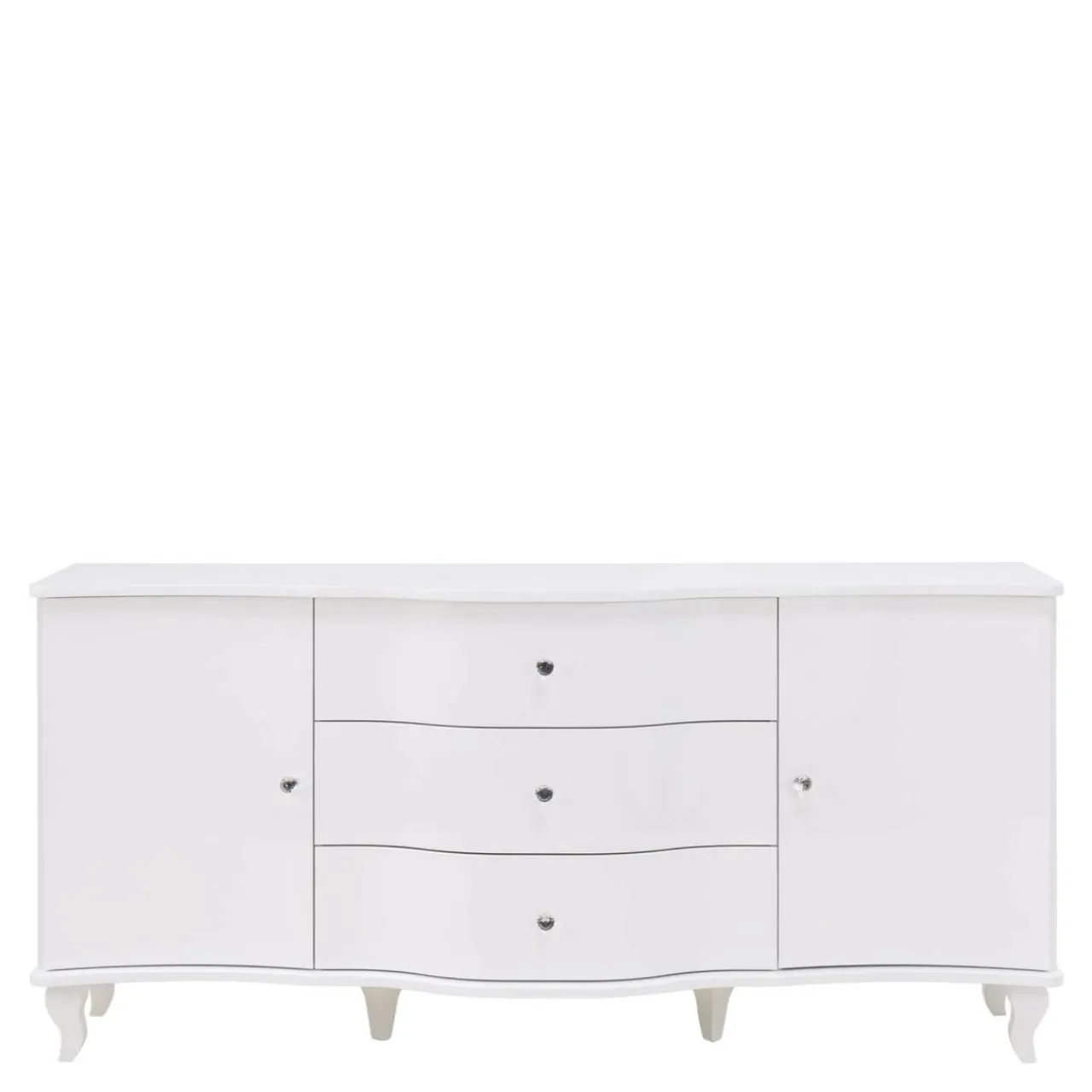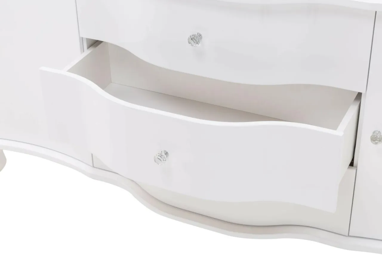 Komodę wykończono połyskującym lakierem. Dzięki temu komoda powiększa optycznie przestrzeń.