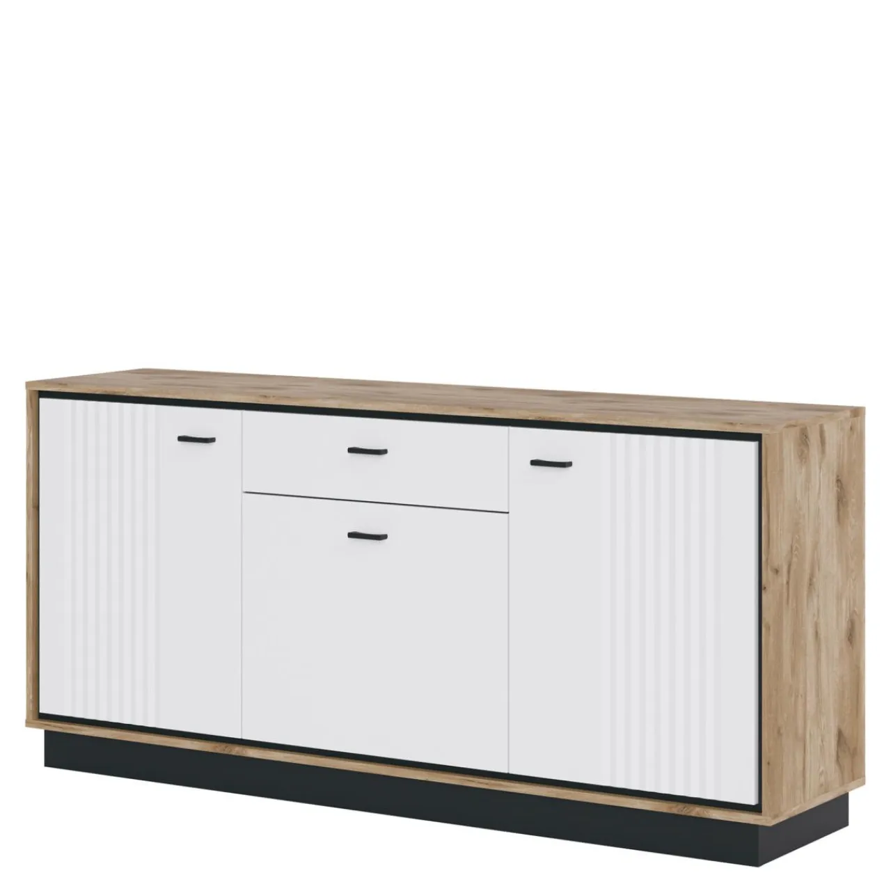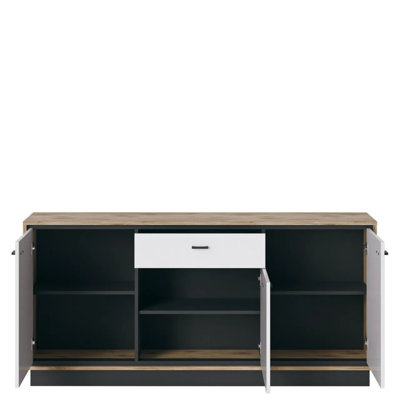 Klasyka zaprezentowana w modernistycznym wydaniu. Bryły skonstruowane są w przemyślany sposób: korpusy w jasnym kolorze dębu postawione są na czarnych podstawach, a całość zamykają białe fronty.