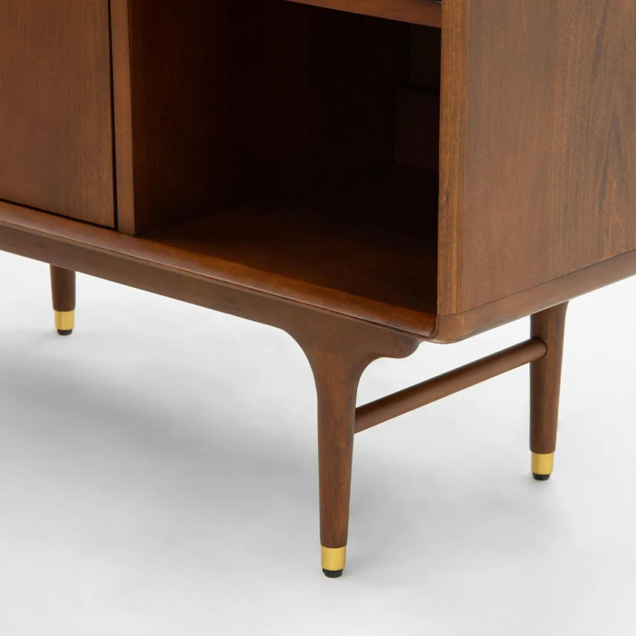 Minimalistyczne akcenty z mosiądzu w postaci uchwytów i końcówek nóżek podkreślają jakość wykonanych mebli.