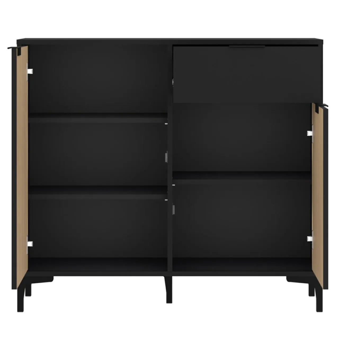 Laminowanie cechuje odporność na drobne zarysowania, dzięki czemu będziesz mógł cieszyć się nowym wystrojem pomieszczenia przez długi czas. Jasne drewno z czarnym kolorem bryły, uchwytów i nóżek tworzy ciekawy kontrast i wzbogaci Twoje wnętrze.