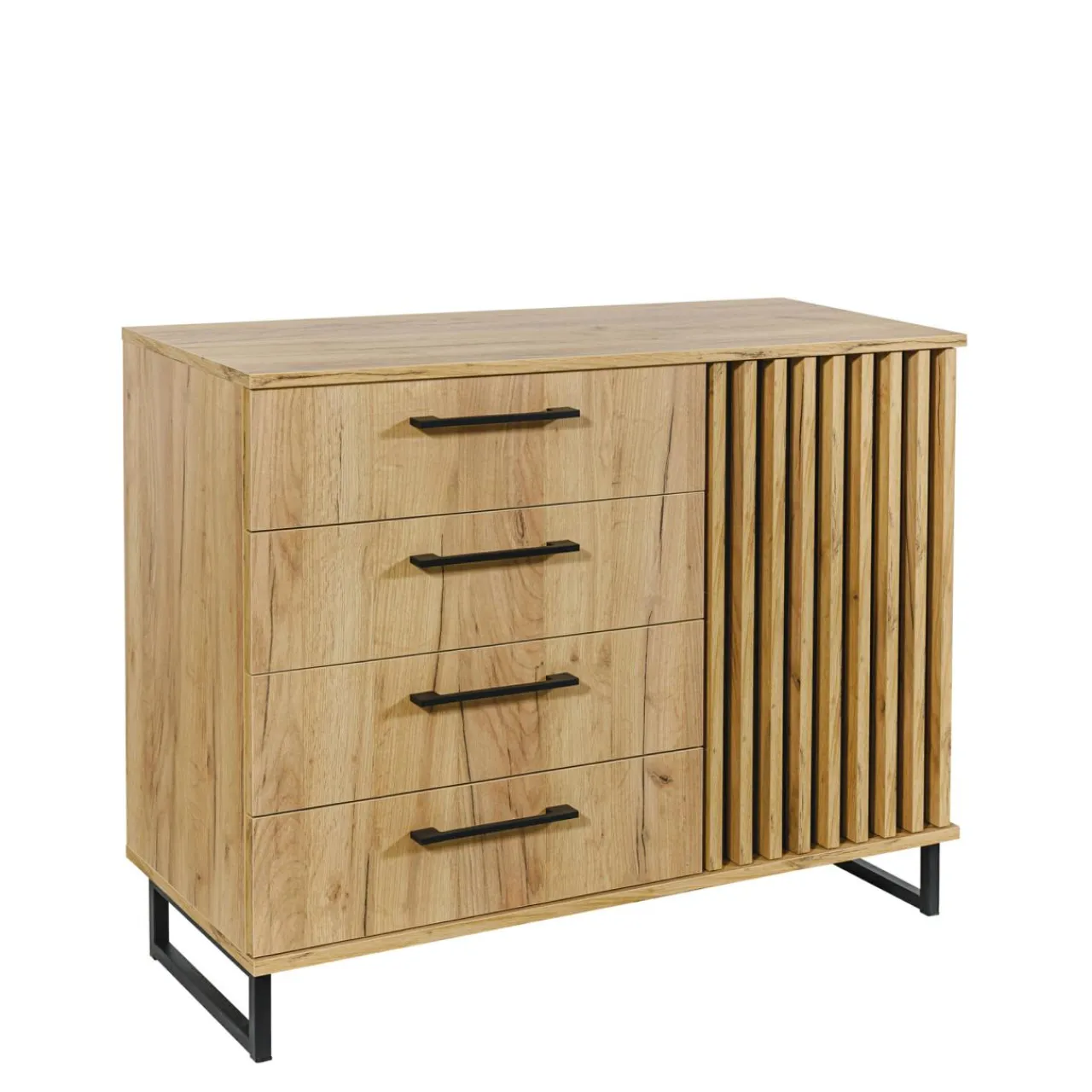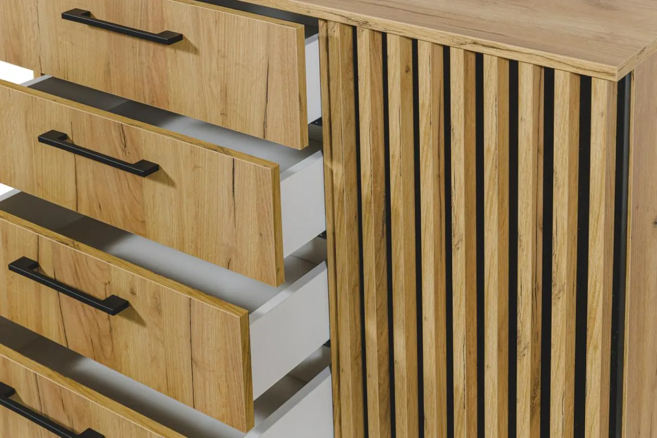 Charakterystyczne lamele dodają nowoczesnego akcentu. Z kolekcją urządzisz modne wnętrze z nutą stylu japandi bez konieczności montowania lameli na ścianach. Liniowy detal na frontach dodaje bryłom smukłości. Pozwala obserwować grę światła i cienia. Cieszy oko symetryczną formą i ciepłym wykończeniem.