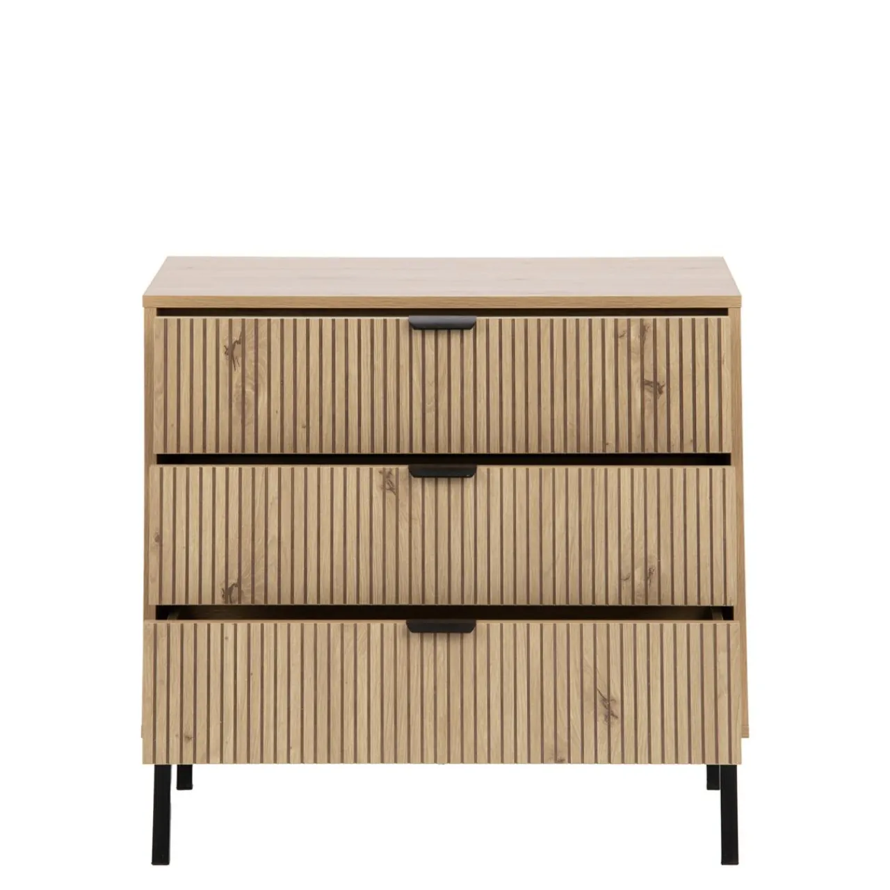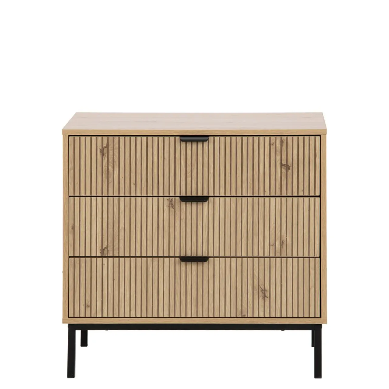 - Komoda posiada 3 szuflady, które łatwo wysuniesz dzięki kulkowym prowadnicom i czarnym metalowym uchwytom.
