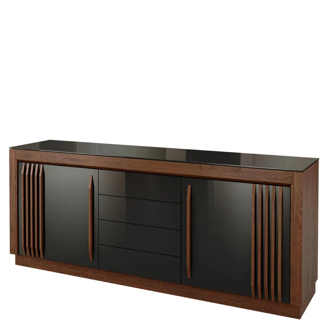 - Połączenie czerni, ciemnego drewna i podłużnych lameli sprawia, że komoda wygląda bardzo elegancko.
