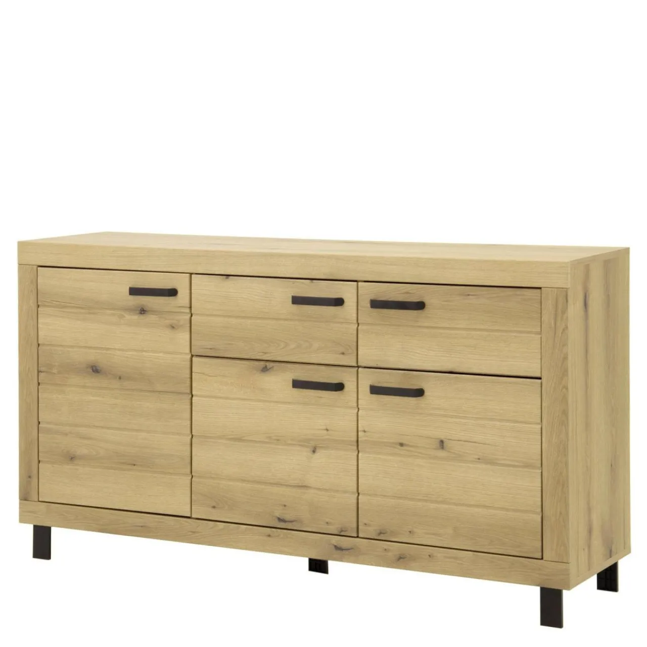 - Komoda wykończona jest laminatem oraz folią, imitującymi naturalny dąb w odcieniu Coast Evoke.
