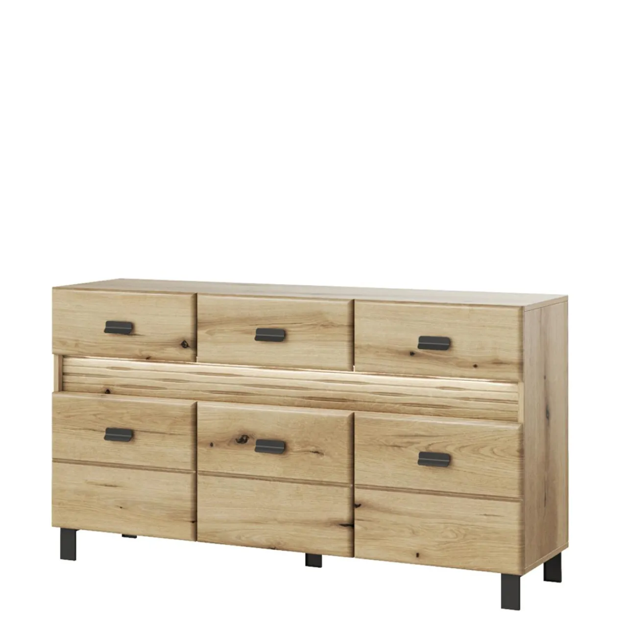 Komoda posiada oświetlenie w postaci taśmy LED – włącz je wieczorem, a nawet o zmroku będziesz mieć w pokoju delikatny, słoneczny poblask.