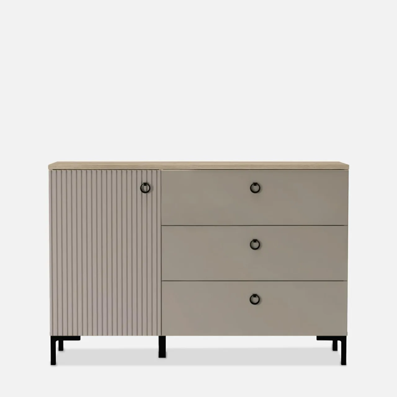 - Ryflowane fronty w kolorze taupe idealnie zgrywają się z korpusami. Wykończone są laminatem i folią.