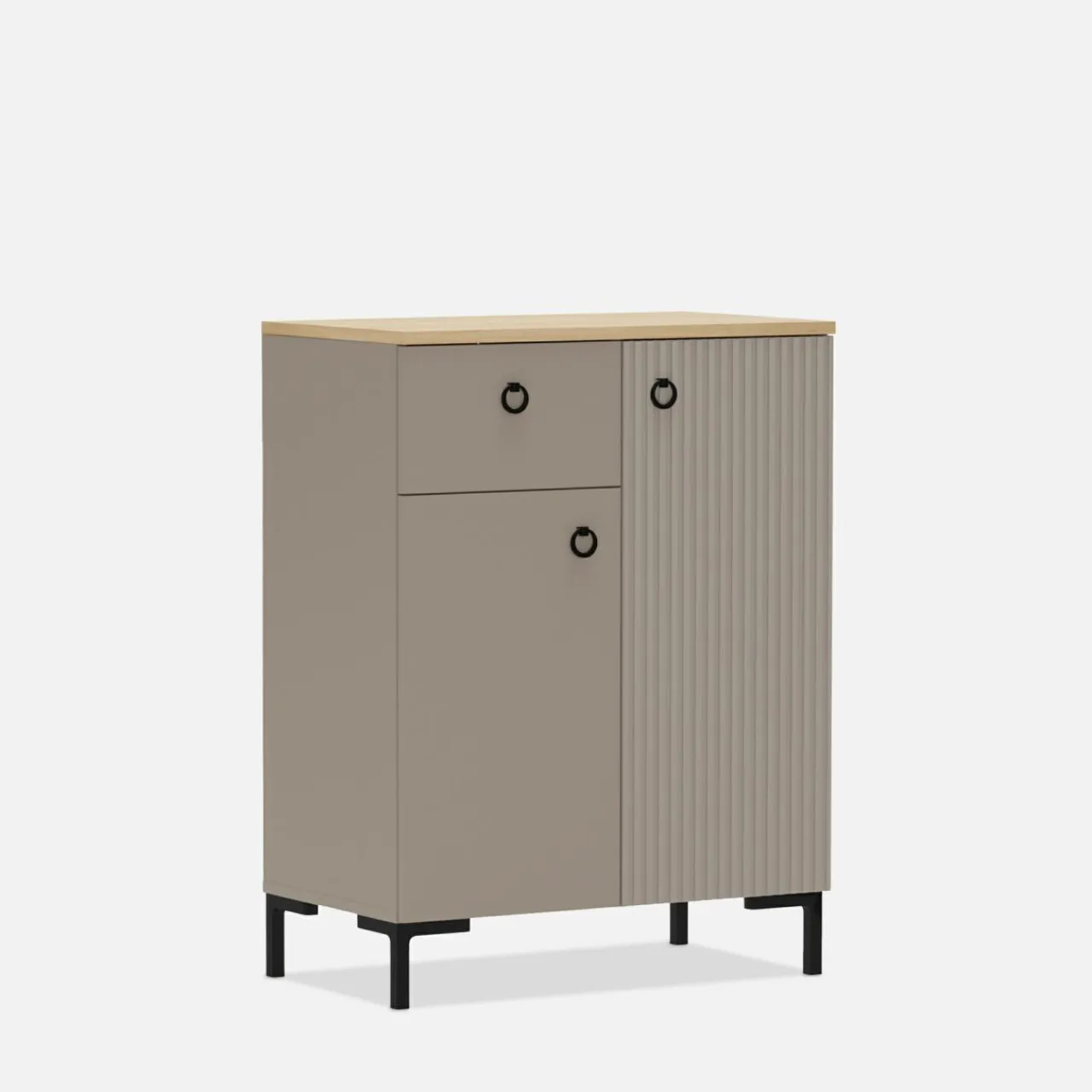 - Ryflowane fronty w kolorze taupe idealnie zgrywają się z korpusami. Wykończone są laminatem i folią.