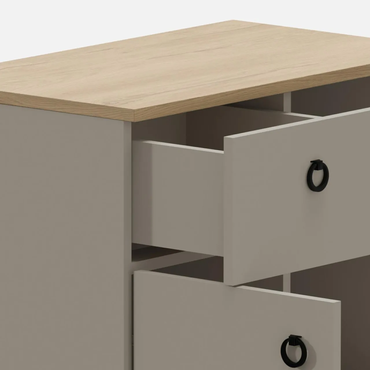 - Wszystkie bryły wykonane są w modnej kolorystyce: korpusy w ciepłym kolorze kawy z mlekiem wieńczone są blatami w wybarwieniu dąb silverjack.