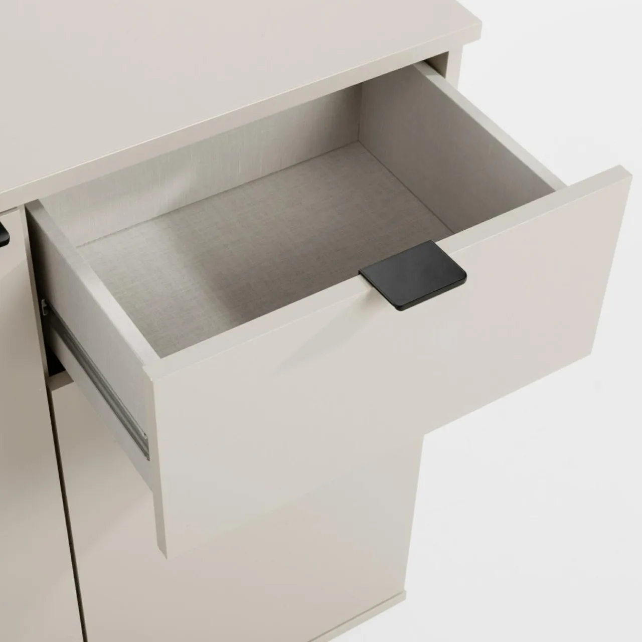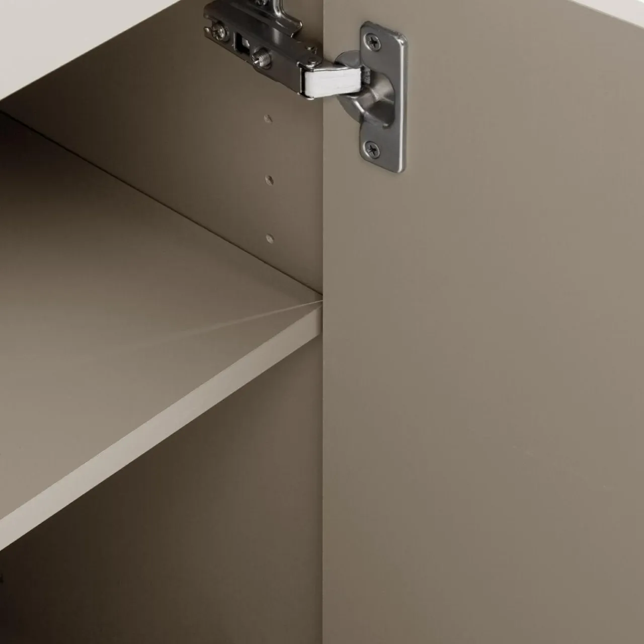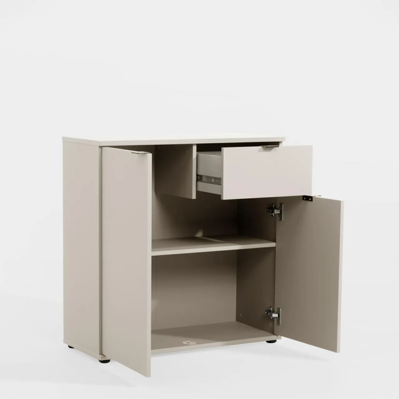 Prosta komoda GANYMEDE w odcieniu jasnego beżu to rozwiązanie do wnętrz w naturalnych tonacjach. Zamykana szafka z półką i praktyczna szuflada zapewniają wygodne przechowywanie.
