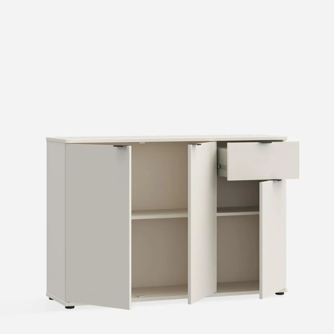 Komoda 3-drzwiowa z szufladą GANYMEDE w odcieniu jasnego beżu to mebel o przemyślanej konstrukcji. Połączenie szafek i szuflady zapewnia wygodne przechowywanie, a jasna kolorystyka optycznie powiększa przestrzeń.