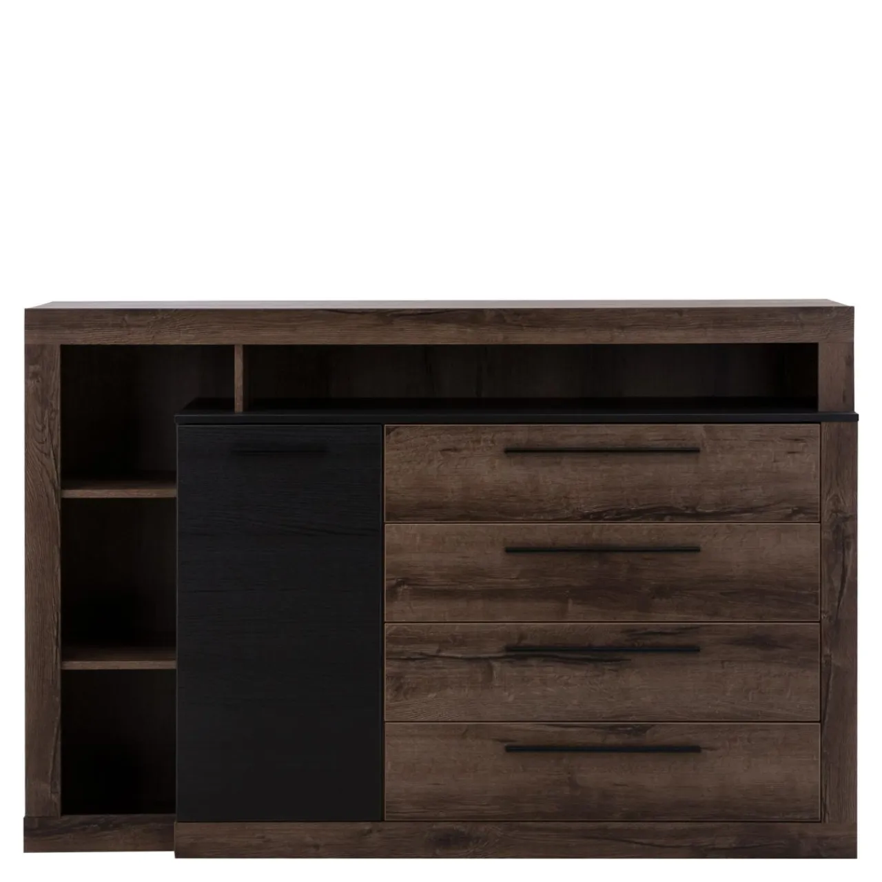 Duża komoda do sypialni RECOVER ułatwi Ci funkcjonalne wyposażenie wnętrza. Oryginalna konstrukcja mebla pozwoli uzyskać wyjątkowy efekt. Połączenie kolorów dąb szlachetny i dąb czarny dodaje stylu.