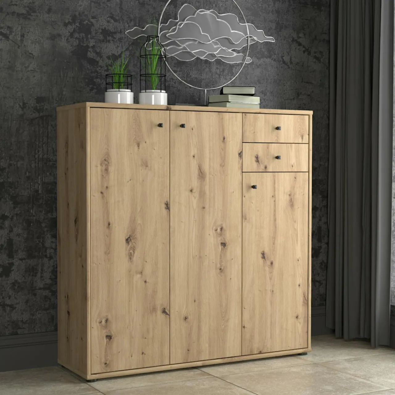 - Kolorystyka dąb artisan umożliwia zestawienie komody z meblami w stylu rustykalnym oraz industrialnym. Ładnie komponuje się również z meblami osadzonymi na czarnych profilach.