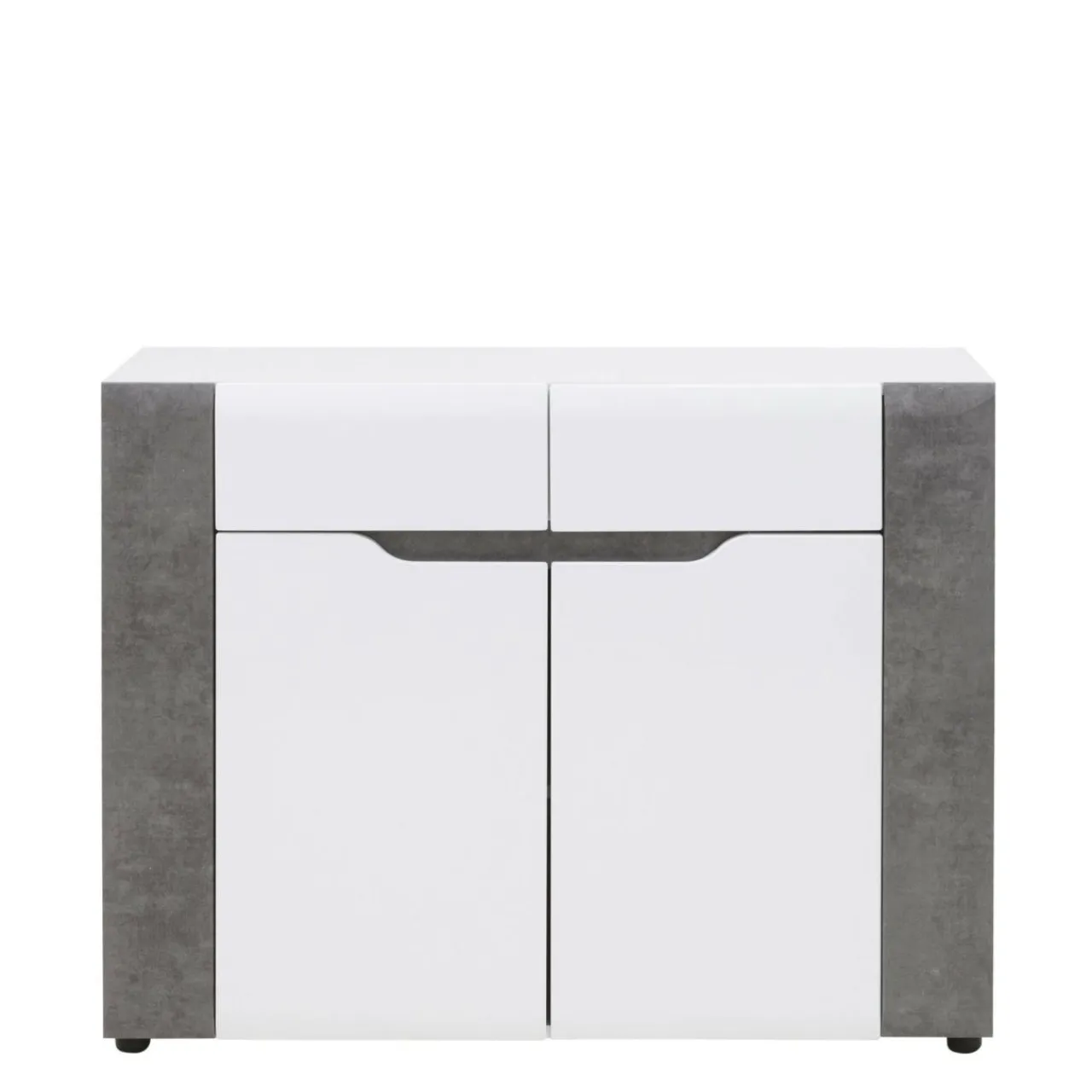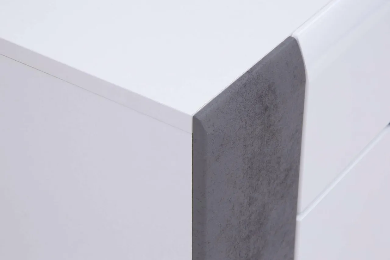 Korpus oraz blaty mebla zostały wykonane z laminowanej płyty meblowej, natomiast fronty to MDF z wykończeniem w białym połysku. Modne zestawienie bieli oraz szarości betonu dodaje komodzie BRANDO nieco surowości złagodzonej poprzez linię podchwytów we frontowej części mebla.