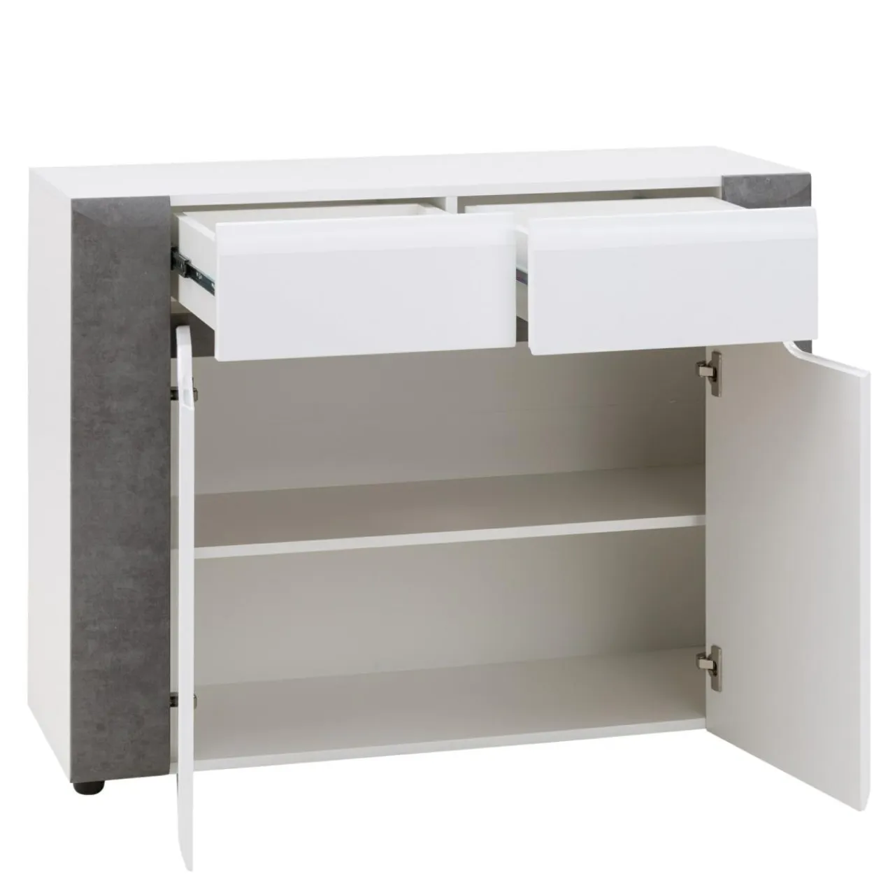 Komoda BRANDO posiada 2 pojemne szuflady na prowadnicach kulkowych w górnej części mebla. Poniżej znajduje się szafka z półkami. Na szczególną uwagę zasługuje fakt, że drzwi zostały wyposażone w zawiasy z systemem cichego domyku.