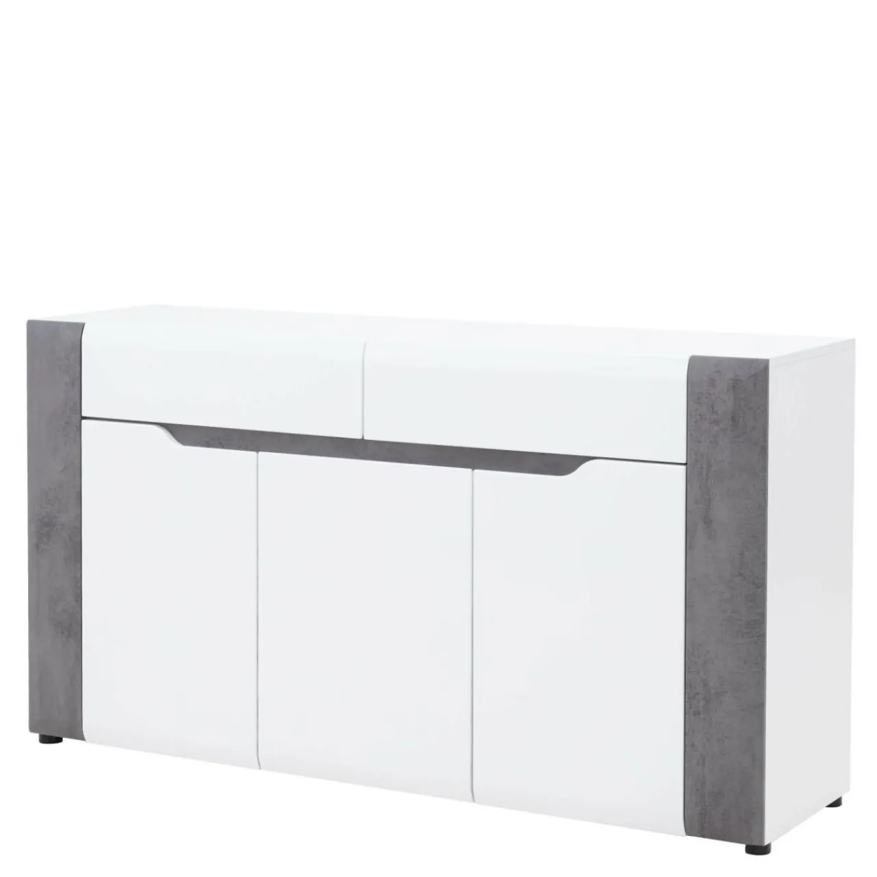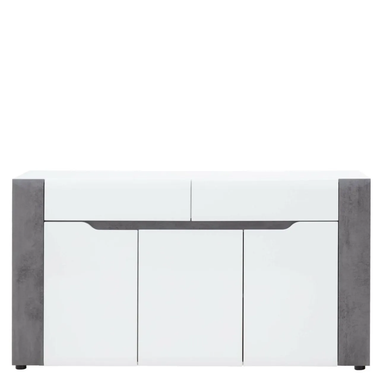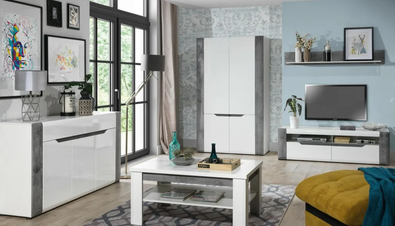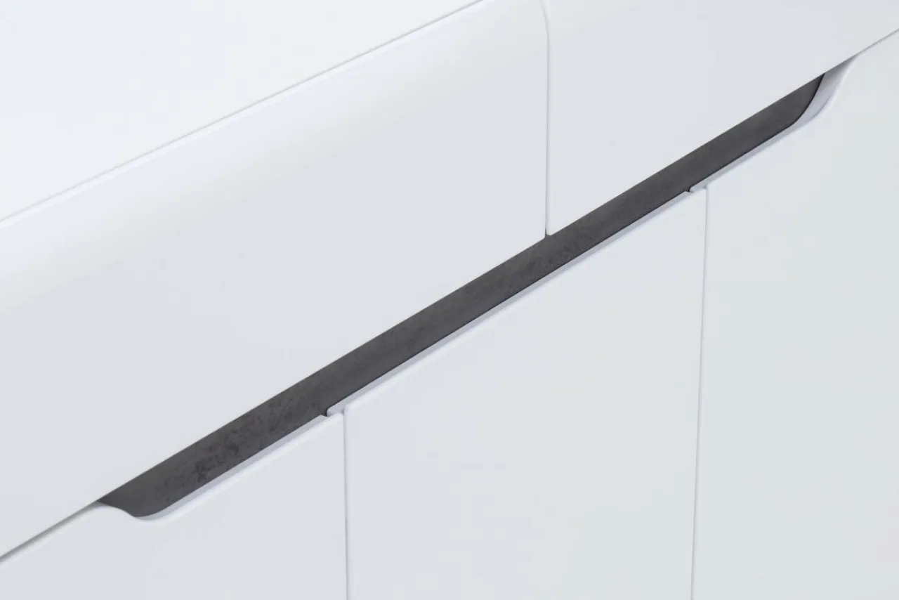 Korpus oraz blaty mebla zostały wykonane z laminowanej płyty meblowej, natomiast fronty to MDF z wykończeniem w białym połysku. Modne zestawienie bieli oraz szarości betonu dodaje komodzie BRANDO nieco surowości złagodzonej poprzez linię podchwytów we frontowej części mebla.