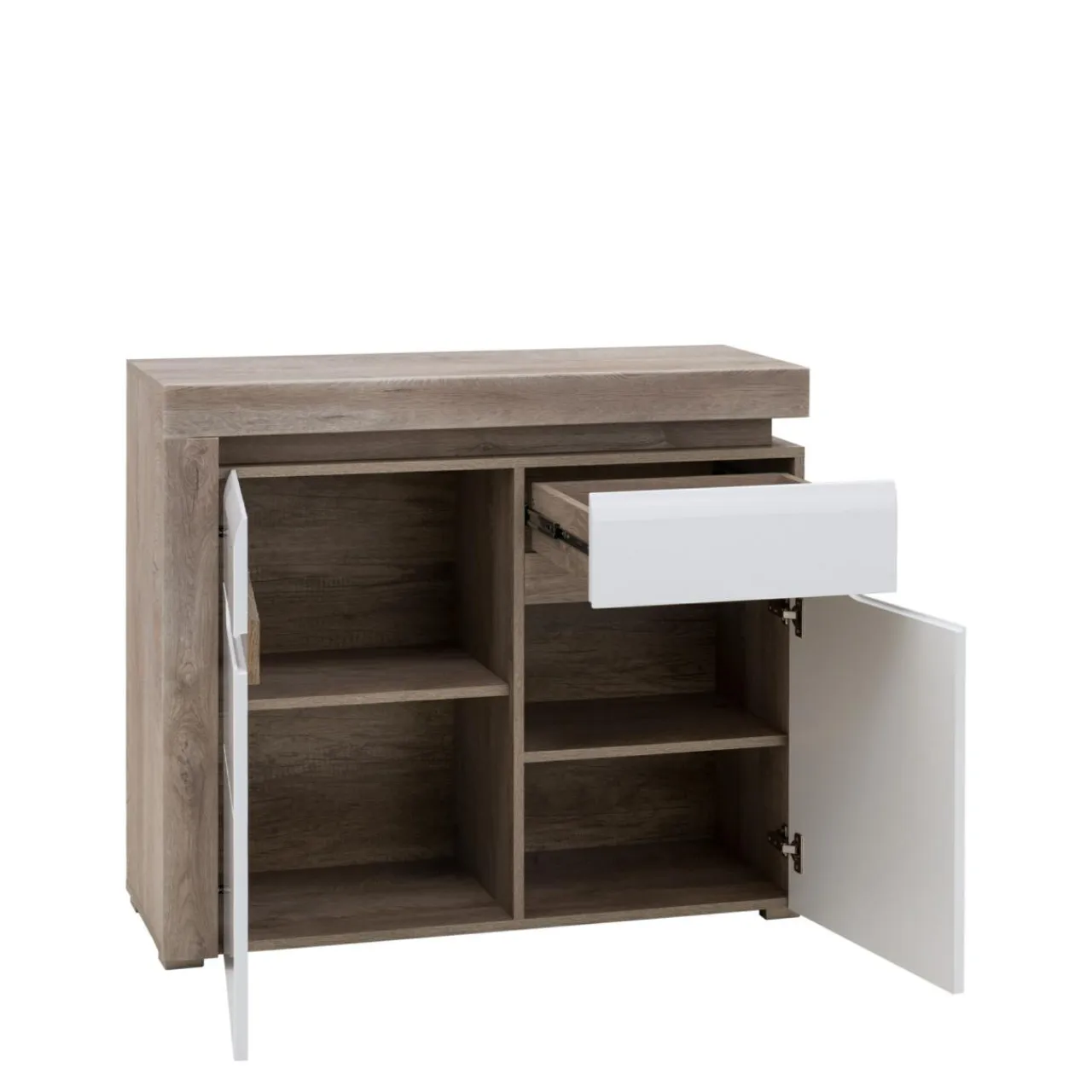 W drzwiach zamontowano zawiasy z systemem cichego domyku, dzięki czemu drzwi nie hałasują podczas zamykania.