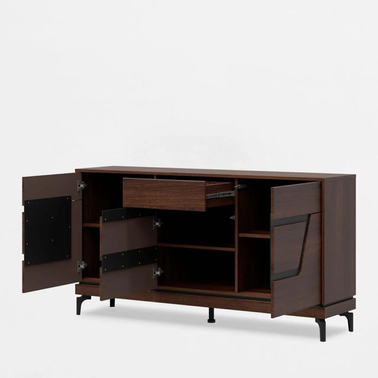 - Meble wykończone są laminatem z rysunkiem drewna. Ciemny, orzechowy kolor posiada niepowtarzalny układ słojów na każdym meblu.