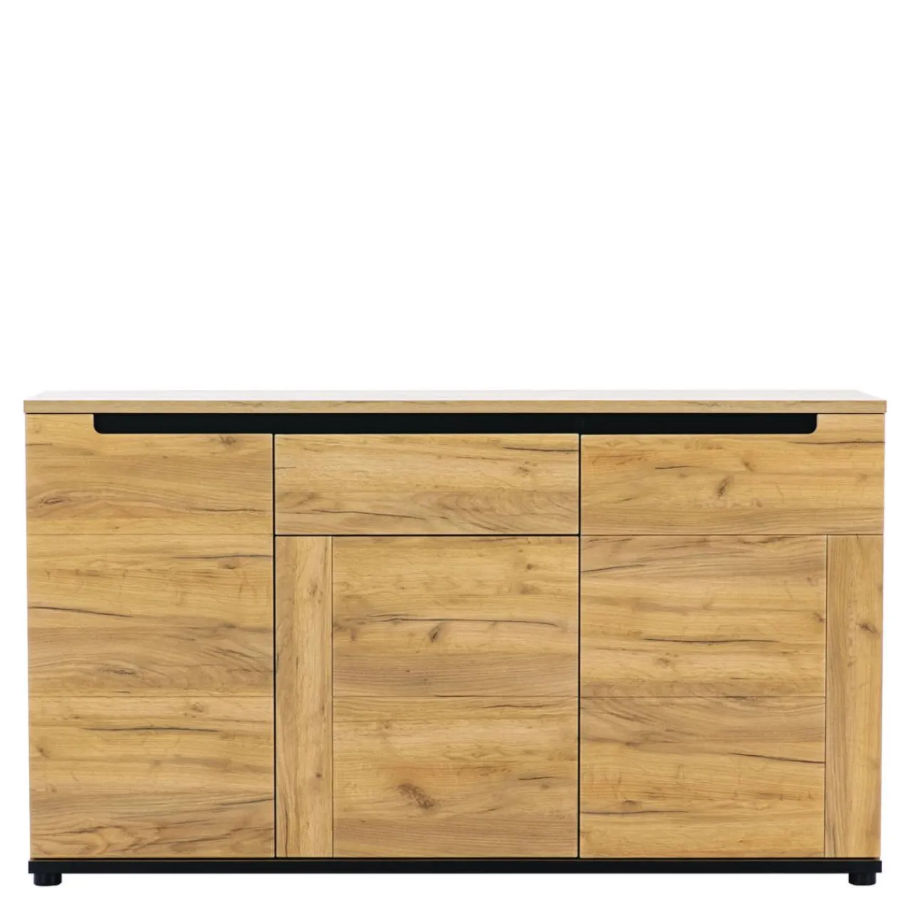 Nowoczesny design komody PRISCO cechują wyważone elementy dekoracyjne oraz kolorystyka, która łączy wybarwienie dąb craft złoty z czarnym kolorem.