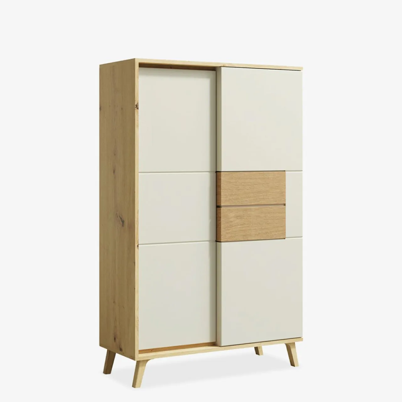 Beżowe bryły rozjaśnią wnętrze, a fronty ze wstawkami z prawdziwego drewna w kolorze dąb artisan nadadzą naturalnego akcentu.