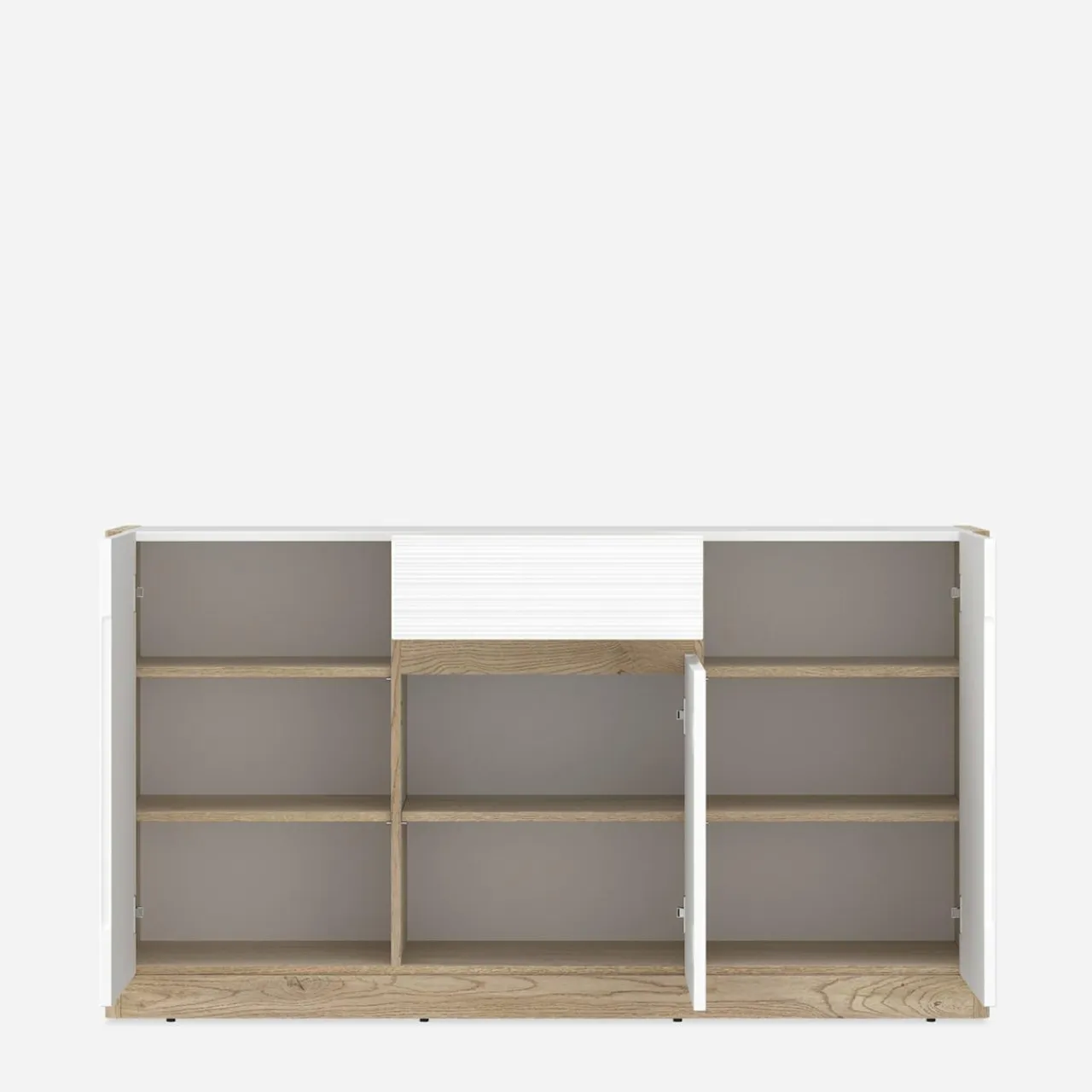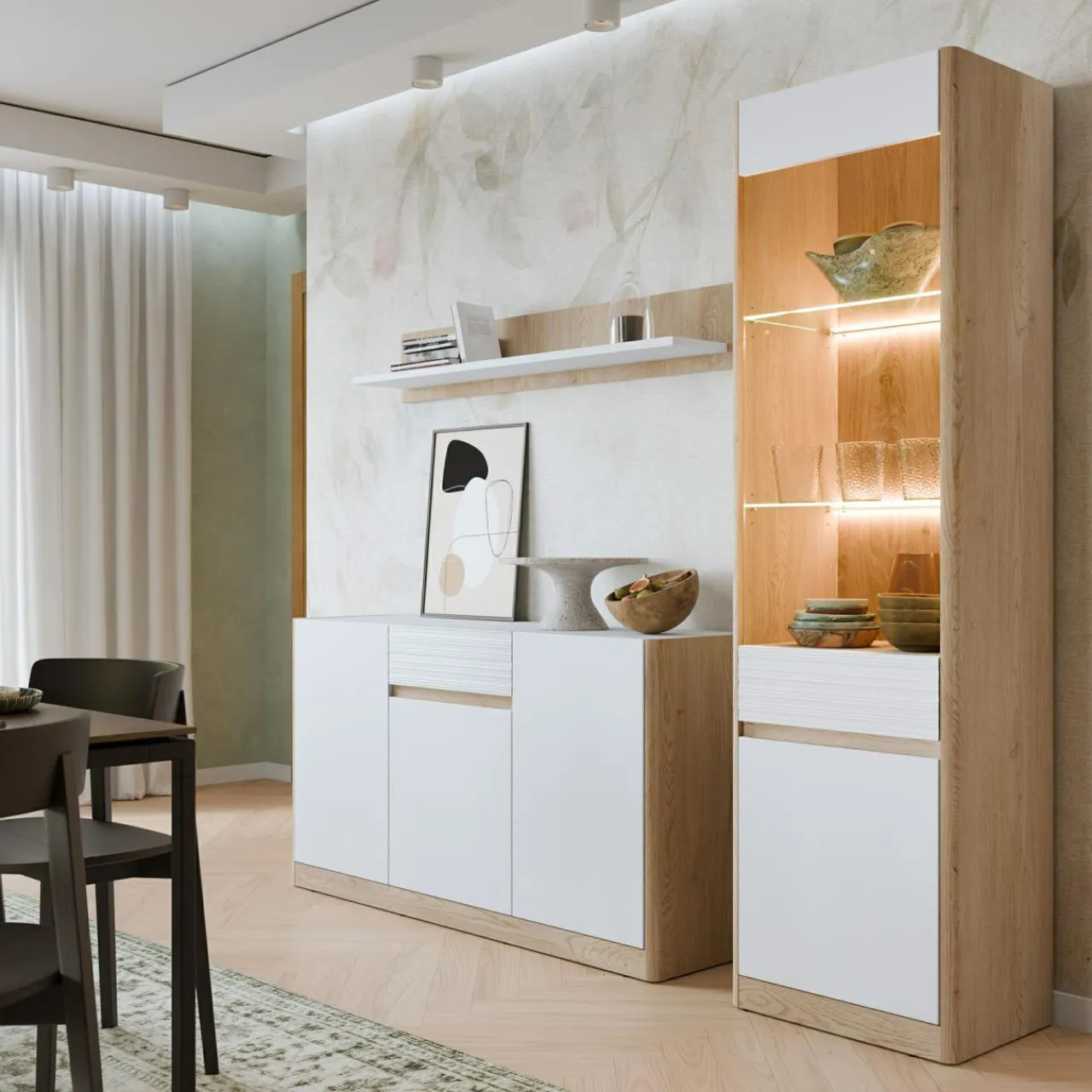 Meble w kolorach dębu cremona i bieli alpin, które wprowadzają świeżość i nowoczesny styl do wnętrz. Praktyczne układy sprawiają, że sprawdzą się w salonie, sypialni czy jadalni. Łączą estetykę jasnego drewna z minimalistycznym wzornictwem, podkreślając charakter przestrzeni.