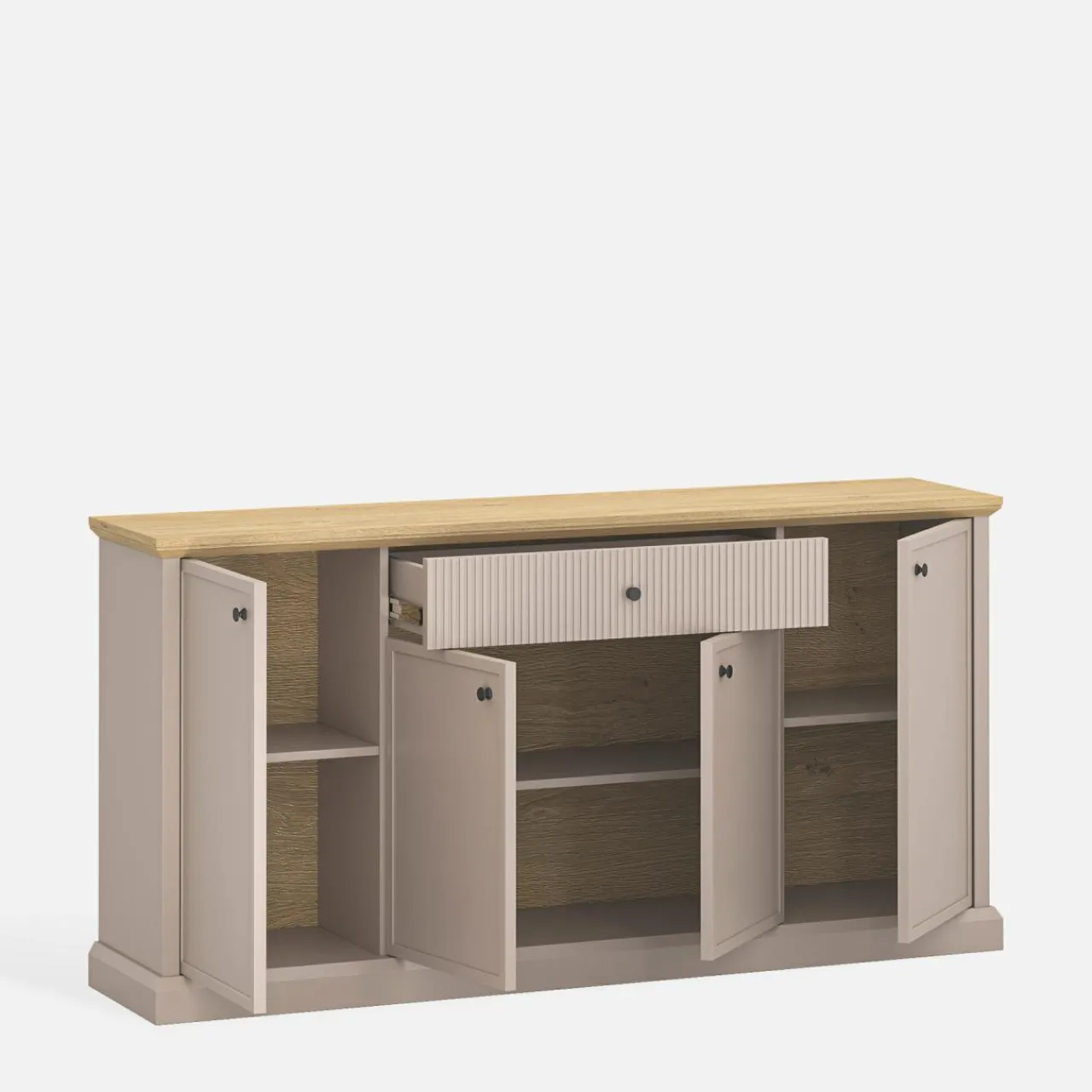 - Wyrazisty design – Połączenie taupe i dębu kamiennego nadaje komodzie elegancki wygląd, a delikatne ryflowanie na drzwiach podkreśla jej wyjątkowy styl.
