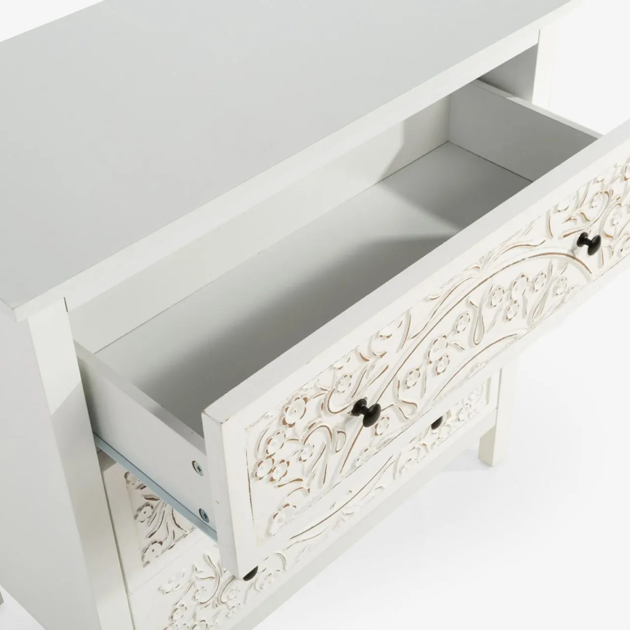 Meble z mini kolekcji FINESELLO wyróżniają niespotykane fronty ozdobione ornamentem – trójwymiarowy dekor uzupełnia nieregularne, dające efekt postarzenia żłobienie. Meble przyciągną spojrzenia i będą stanowić piękną ozdobę w sypialni.
