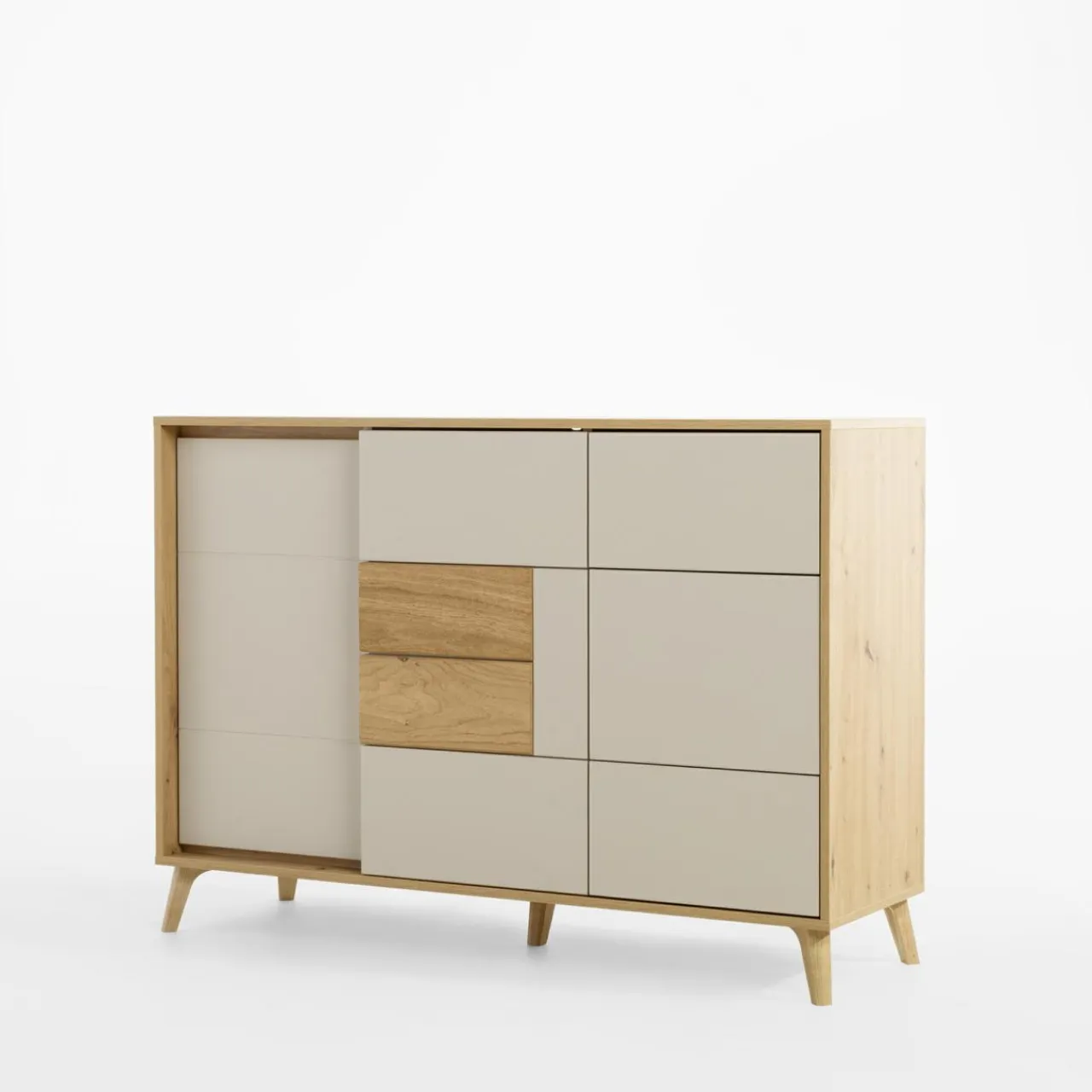 Beżowe bryły rozjaśnią wnętrze, a fronty ze wstawkami z prawdziwego drewna w kolorze dąb artisan nadadzą naturalnego akcentu.