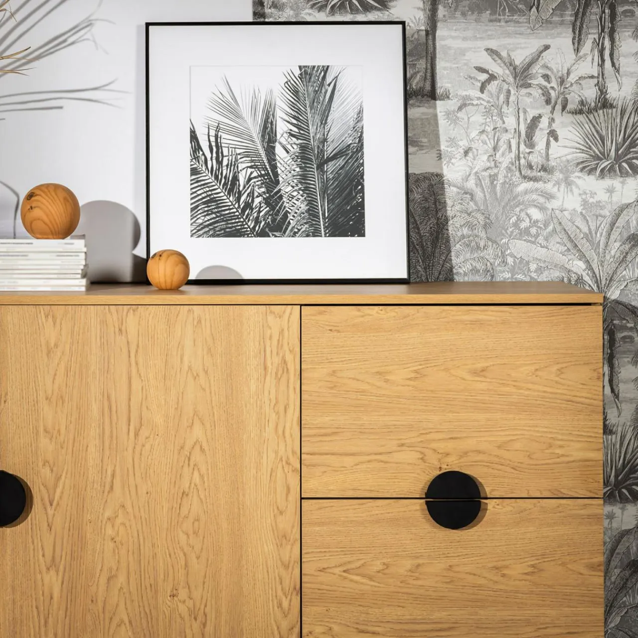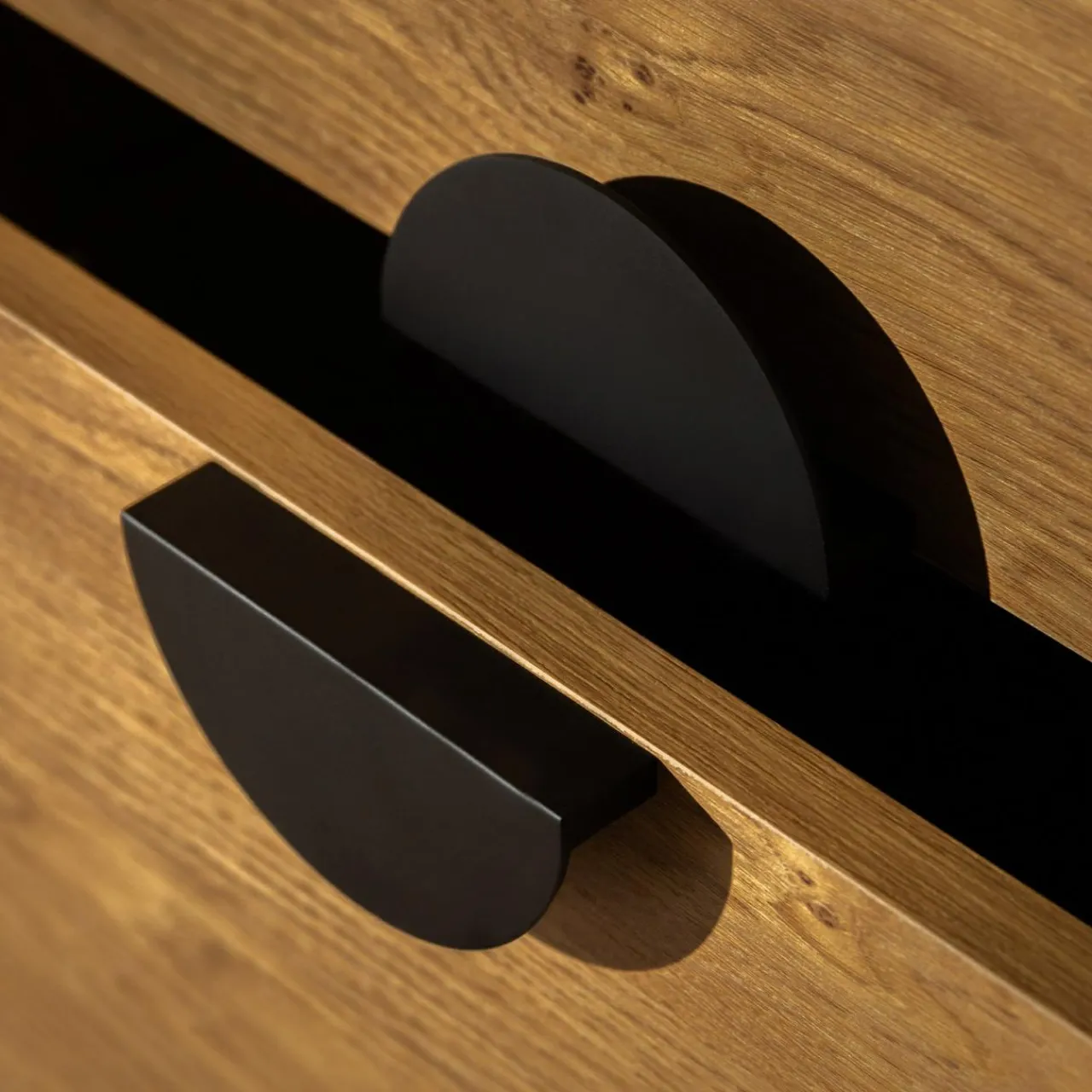 - Półokrągłe metalowe uchwyty wyraźnie odznaczają się na frontach, tworząc kontrast dla ciemnych mebli.