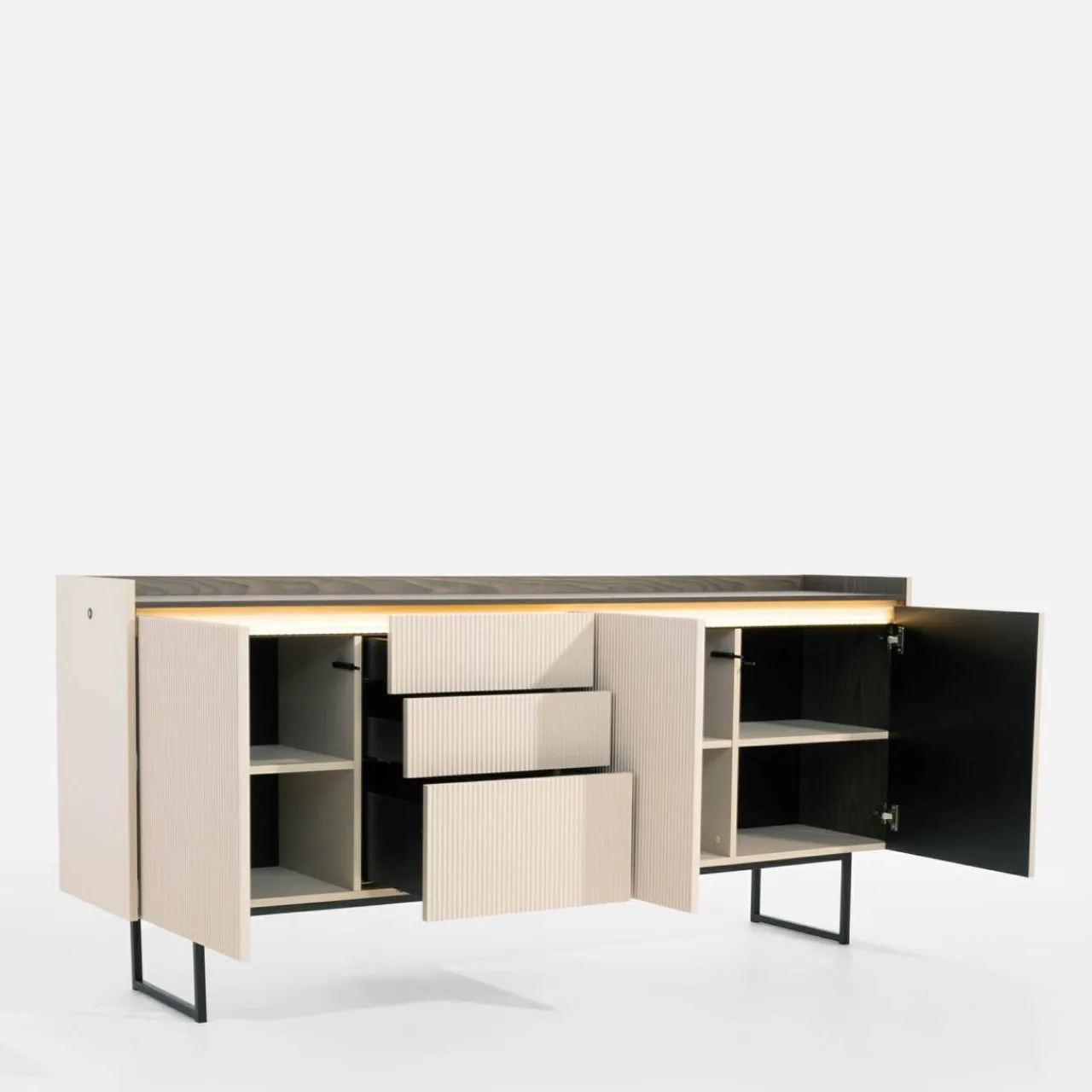 Komoda LAGO o szerokości 192 cm świetnie sprawdzi się w dużym salonie, gdzie będzie miała szansę się zaprezentować. Półki świetnie sprawdzą się do przechowywania kompletów zastawy, zapasowych obrusów czy pościeli, natomiast szuflady będą odpowiednie na płaskie teczki czy inne drobiazgi.