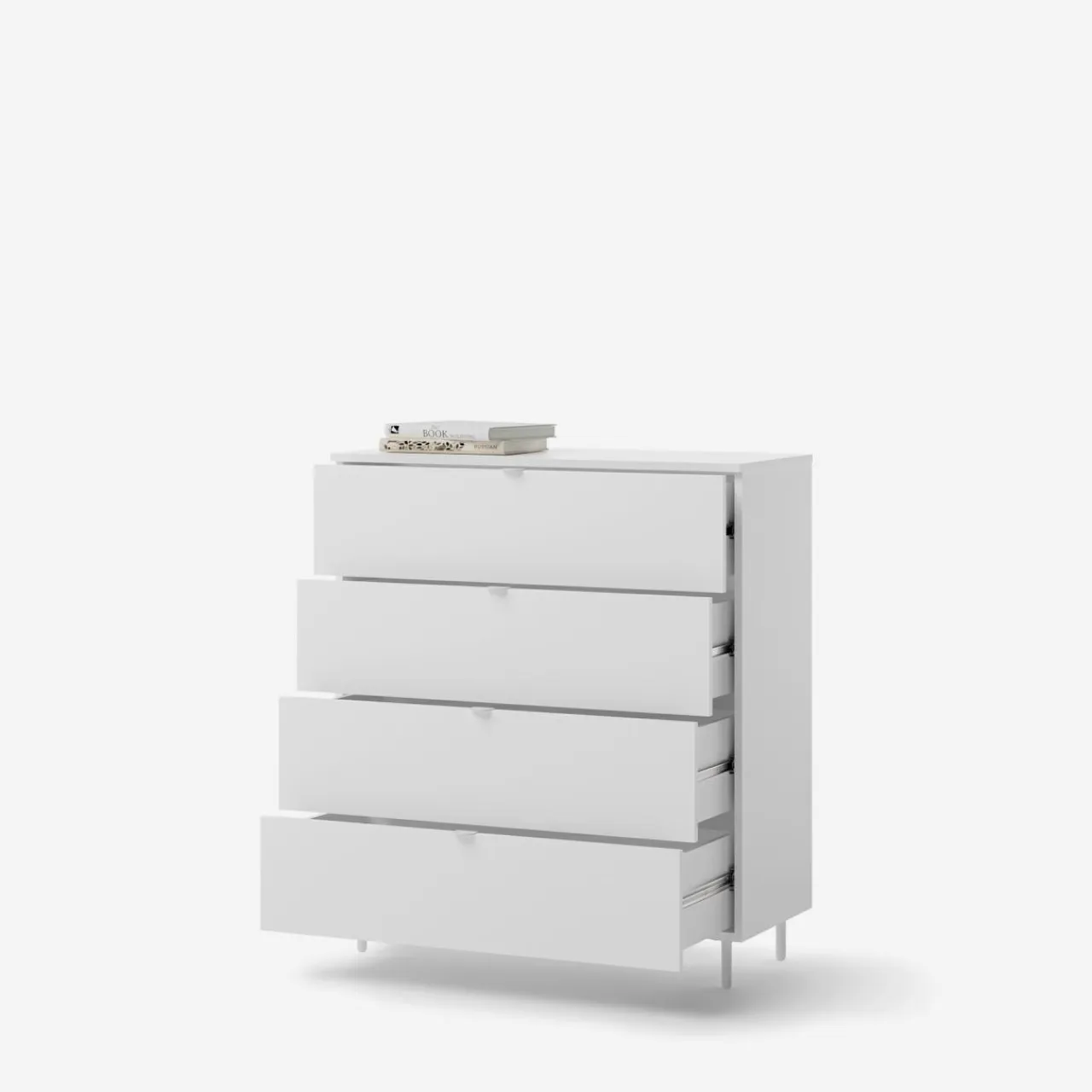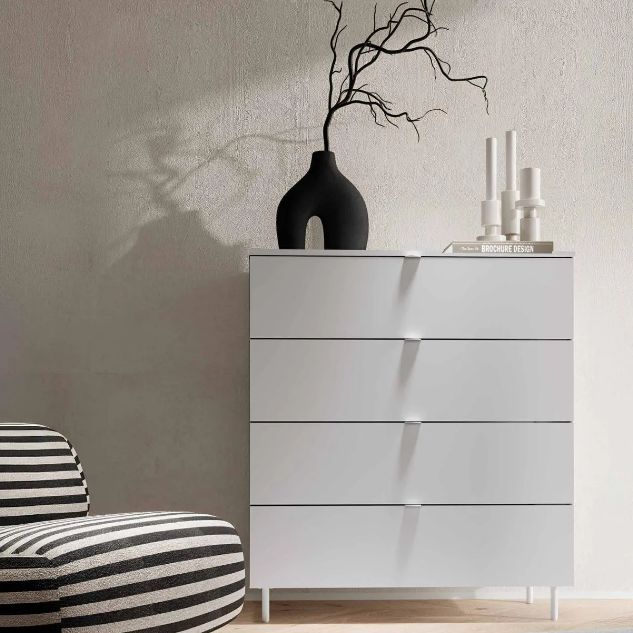 Komoda z szufladami MILA na metalowych nóżkach w białym wykończeniu to elegancki i praktyczny mebel, który wprowadza świeżość i lekkość do wnętrza. Jej neutralna kolorystyka sprawdzi się w aranżacjach skandynawskich, nowoczesnych lub minimalistycznych, doskonale łącząc się z odcieniami drewna, szarościami czy pastelami.