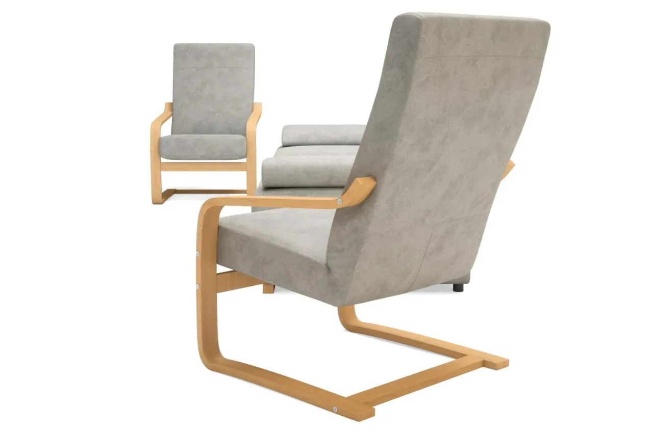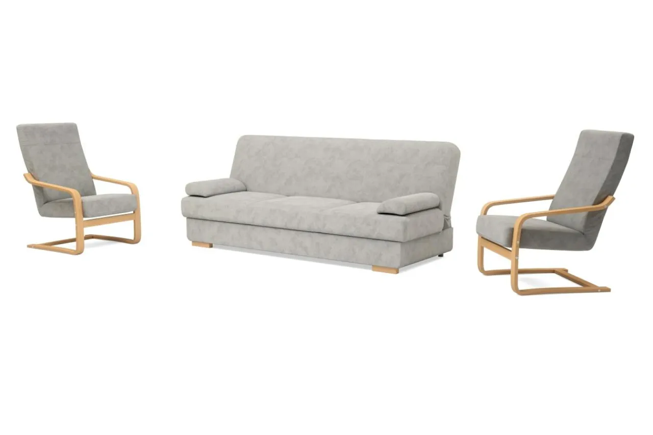 Zgrabna wersalka i dwa fotele na płozach zbudowanych z elastycznego i trwałego stelaża drewnianego to komplet z którego skorzysta aż pięć osób. Wersalka posiada funkcję spania z mechanizmem wersalkowym typu „klik-klak”. Pojemnik na pościel znajduje się pod siedziskiem. Drewniane płozy fotela dodają uroku i podkreślają charakter mebla.