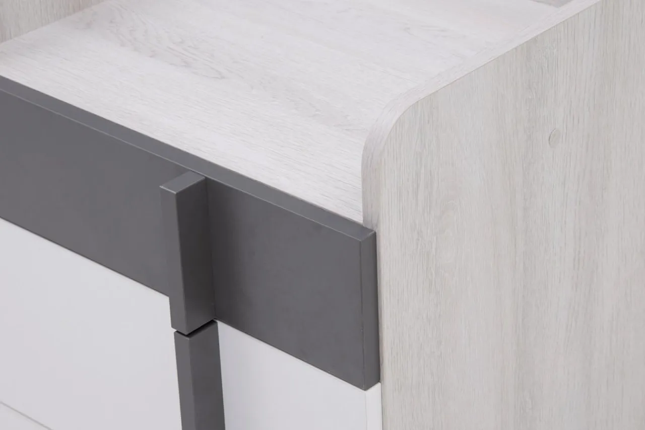 - Mebel pokryto laminatem białym, laminatem szarym i w kolorze białego dębu Wilson.