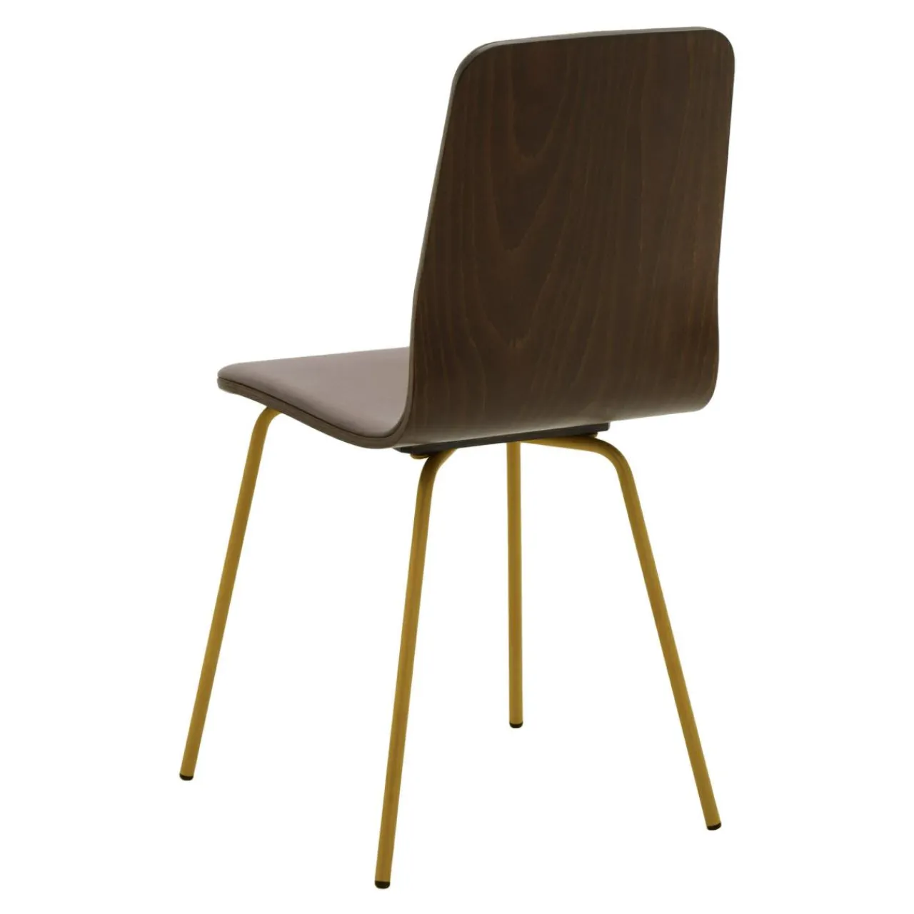 - Siedzisko i oparcie krzesła wykonano ze sklejki. Sklejkę pokryto bejcą w kolorze orzecha.