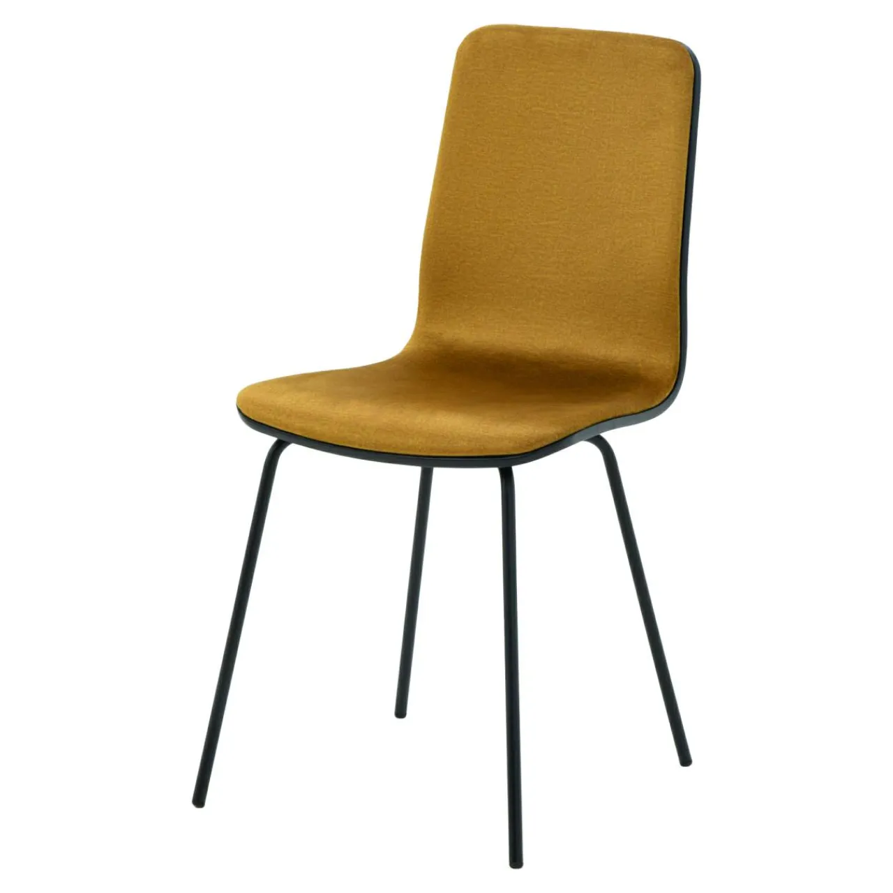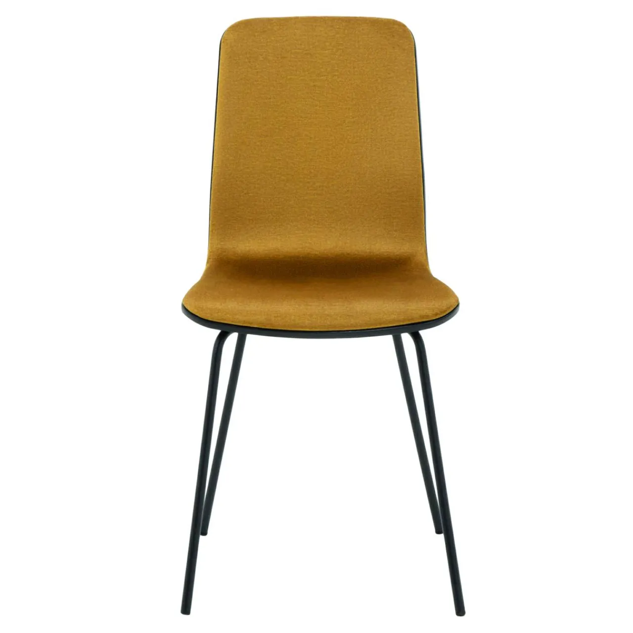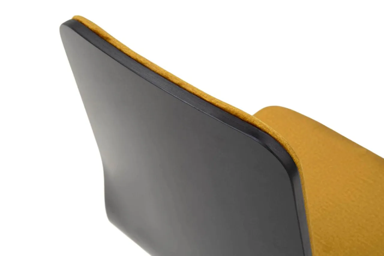 - Krzesło posiada miłą w dotyku welurową tapicerkę w kolorze musztardowym. Tkanina posiada efekt delikatnego połysku.