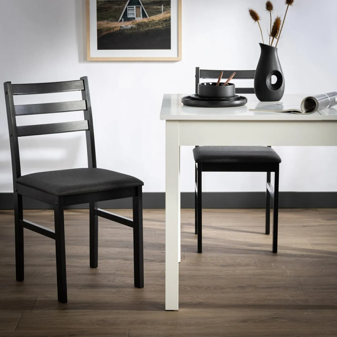 Prosty design krzesła sprawia, że świetnie wpisuje się we wnętrza urządzone w stylu nowoczesnym czy dark nordic.
