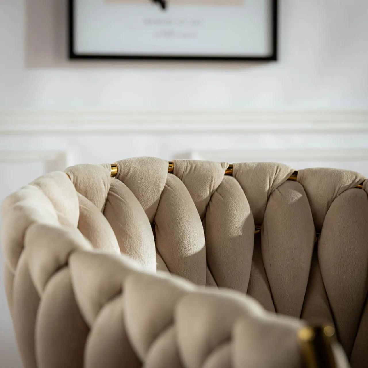 - Krzesło zostało obite miłym w dotyku welurem w kolorze kobiecego beżu, który dodaje romantycznego charakteru.