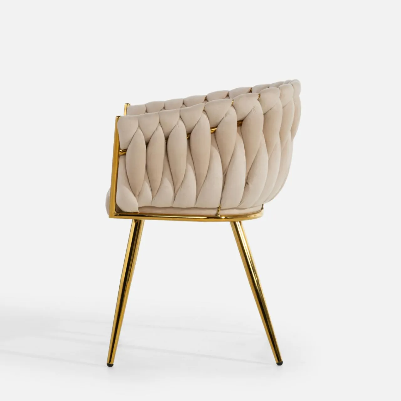 Szukasz eleganckiego krzesła? LIANA przykuwa wzrok welurową plecionką i złotymi nogami, które podkreślają stylowy wygląd. Z powodzeniem sprawdzi się w aranżacjach w stylu glamour.