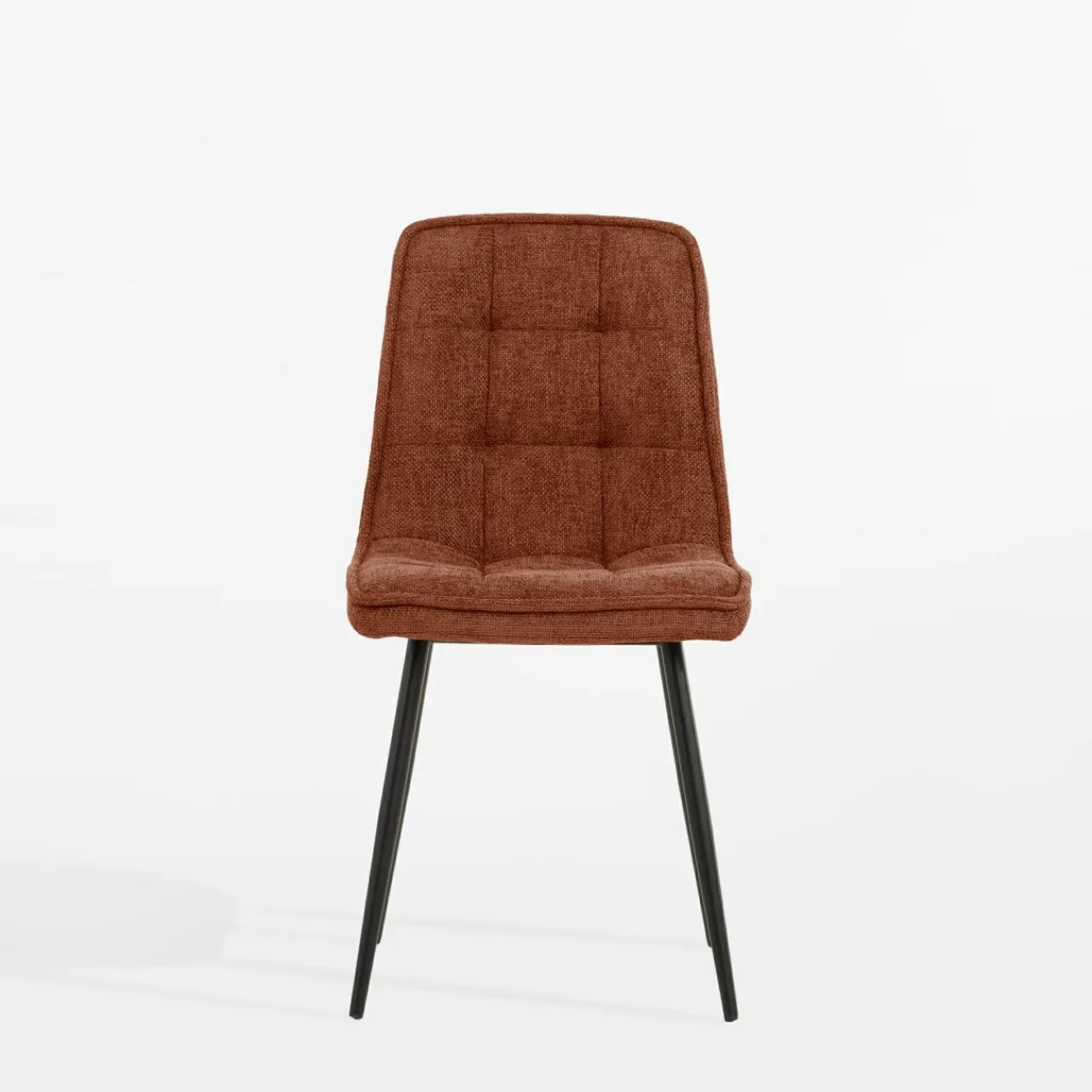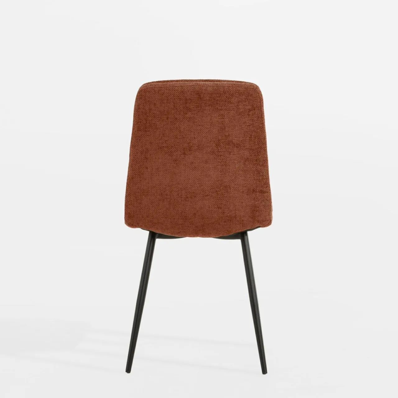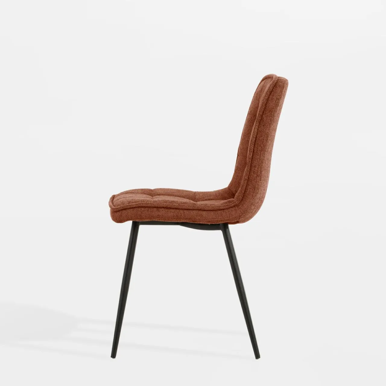 Krzesło PIMIXI w rudym odcieniu z czarnymi, matowymi nogami nadaje przestrzeni ciepła i charakteru.