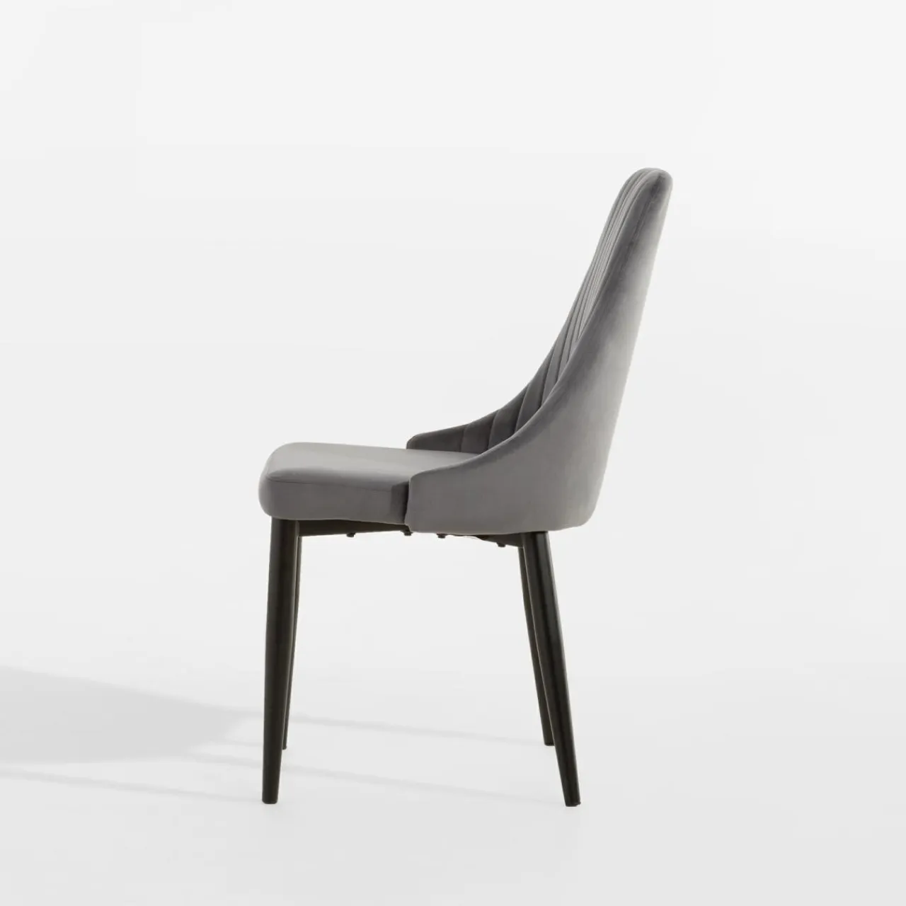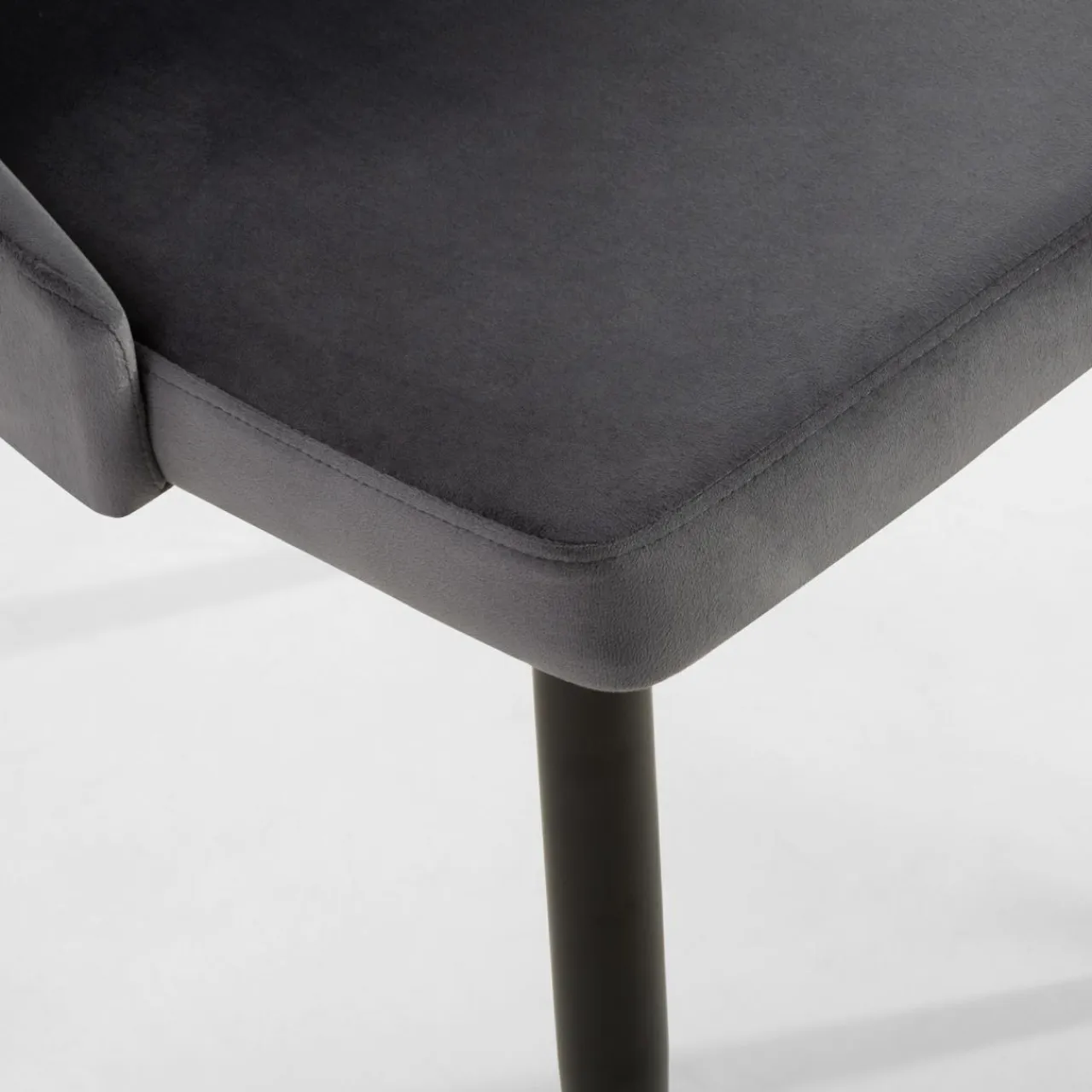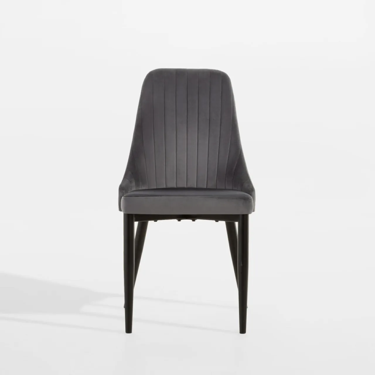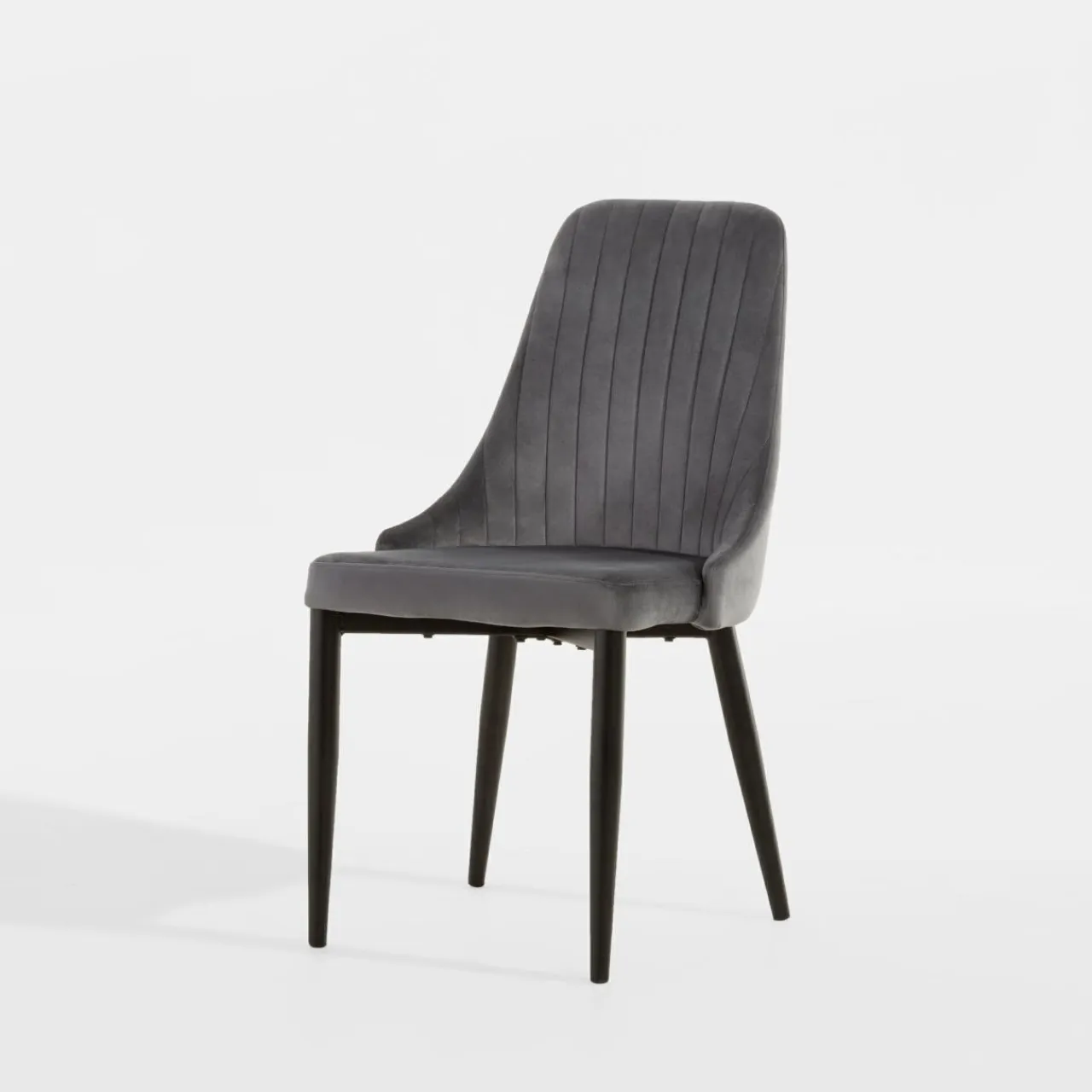 Podkreśl nowoczesny styl swojej jadalni z krzesłem HOMESTED. Stalowy stelaż wybarwiony na czarno połączony z szarym odcieniem weluru wpisze się w ciemne aranże, również loftowe. Ciekawe pionowe przeszycia podkreślą nowoczesny styl aranżacji.